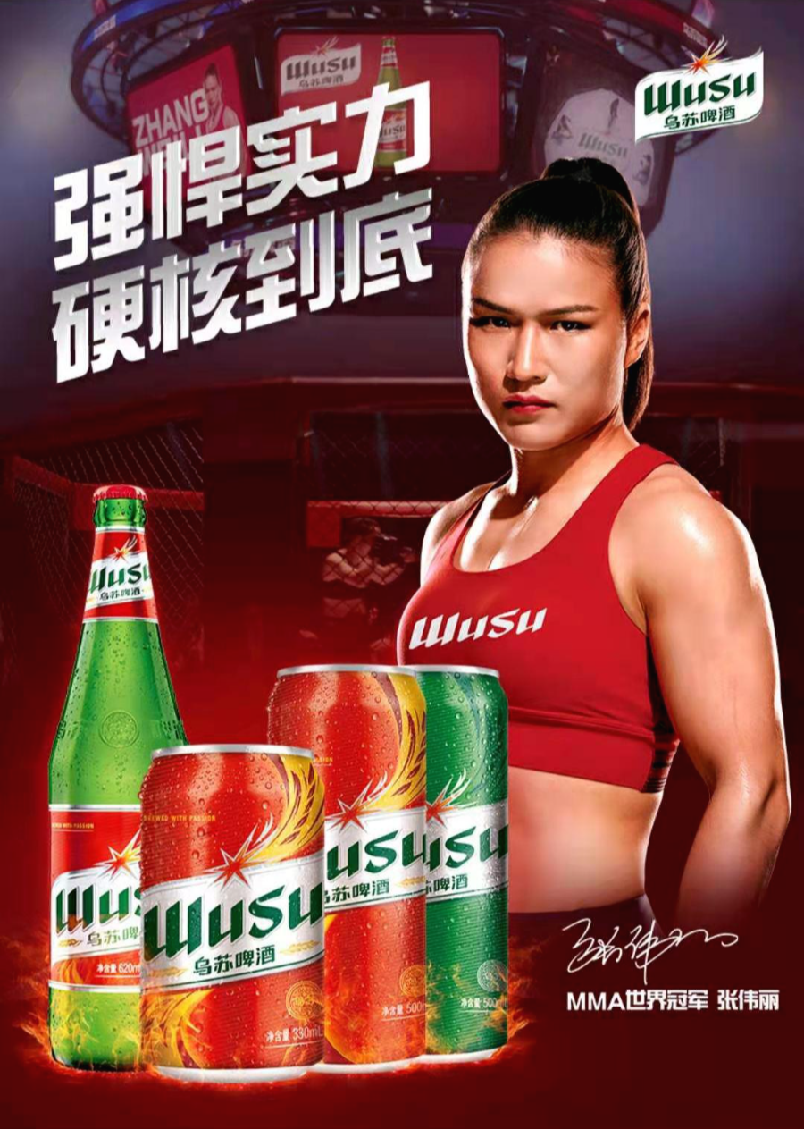 광고 모델은 동아시아인 최초 UFC 챔피언인 장 웨일리(张伟丽)인데,