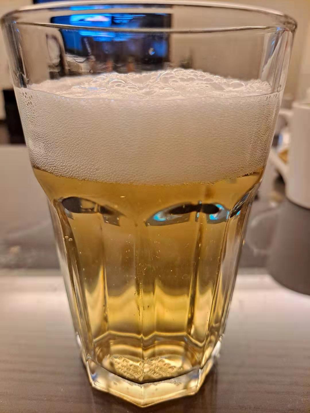 맥주의 색은 전형적인 라거 맥주의 노란 투명색입니다.