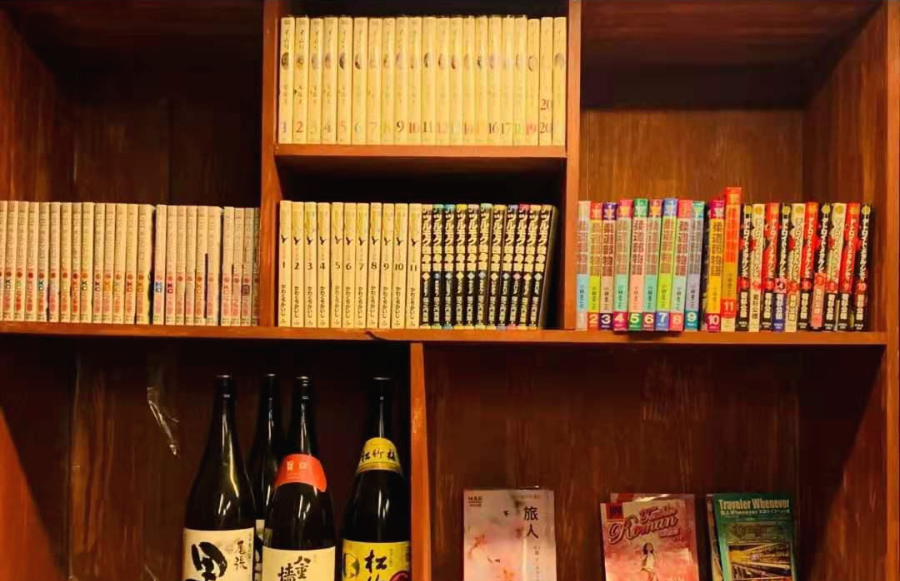 일본 라멘 전문점답게 일본 만화책과 빈 사케병이 전시되어 있습니다.