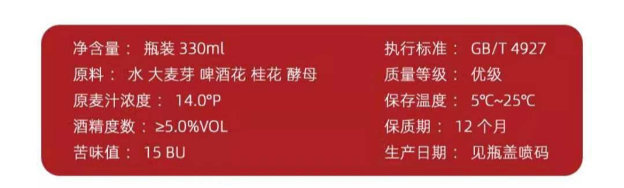 원재료는 : 물(水), 보리(大麦芽), 홉(啤酒花), 계화(桂花), 효모(酵母)