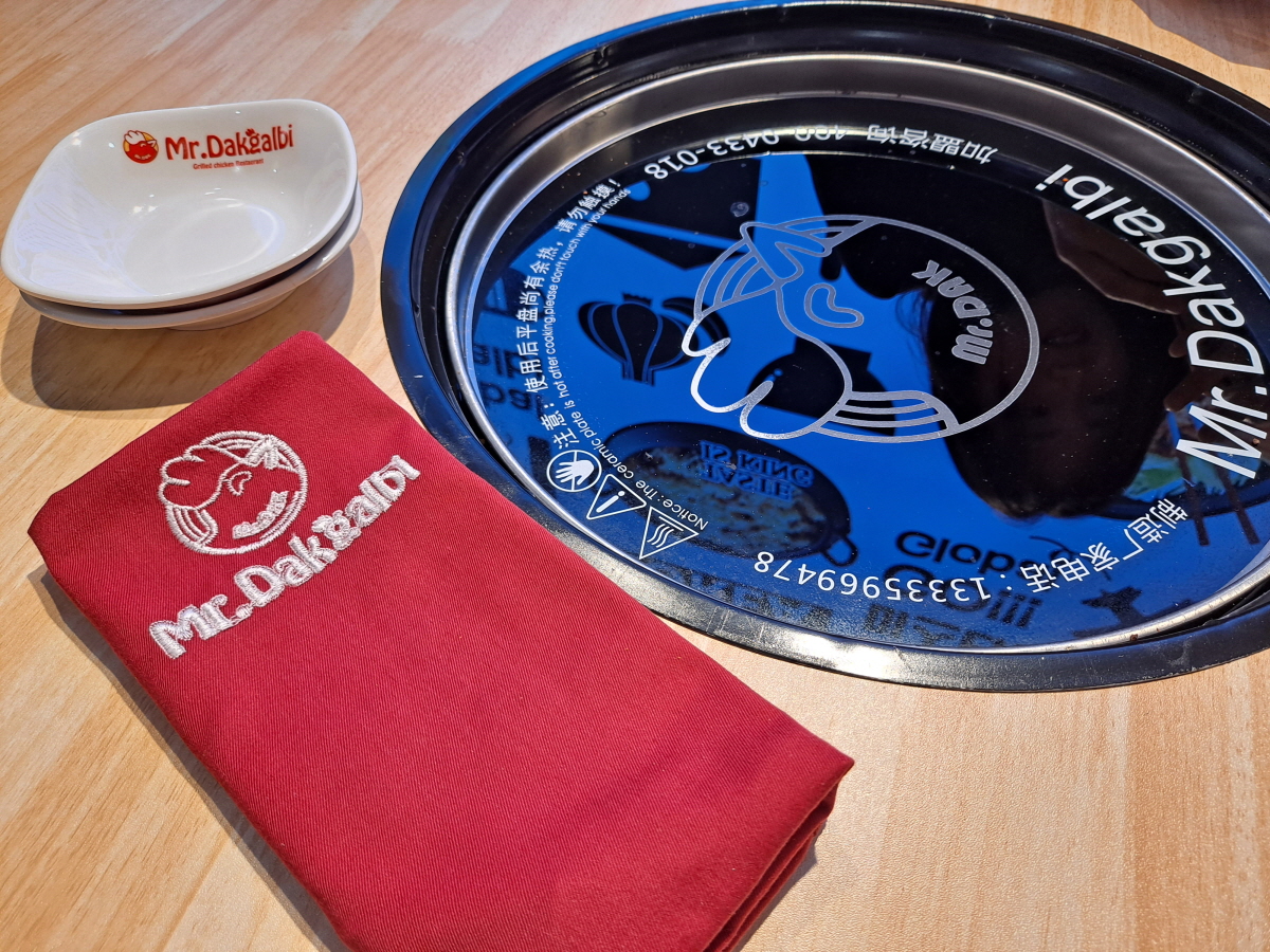 앞치마와 그릇 인덕션에 미스터 닭갈비 로고가 다 들어가 있습니다.