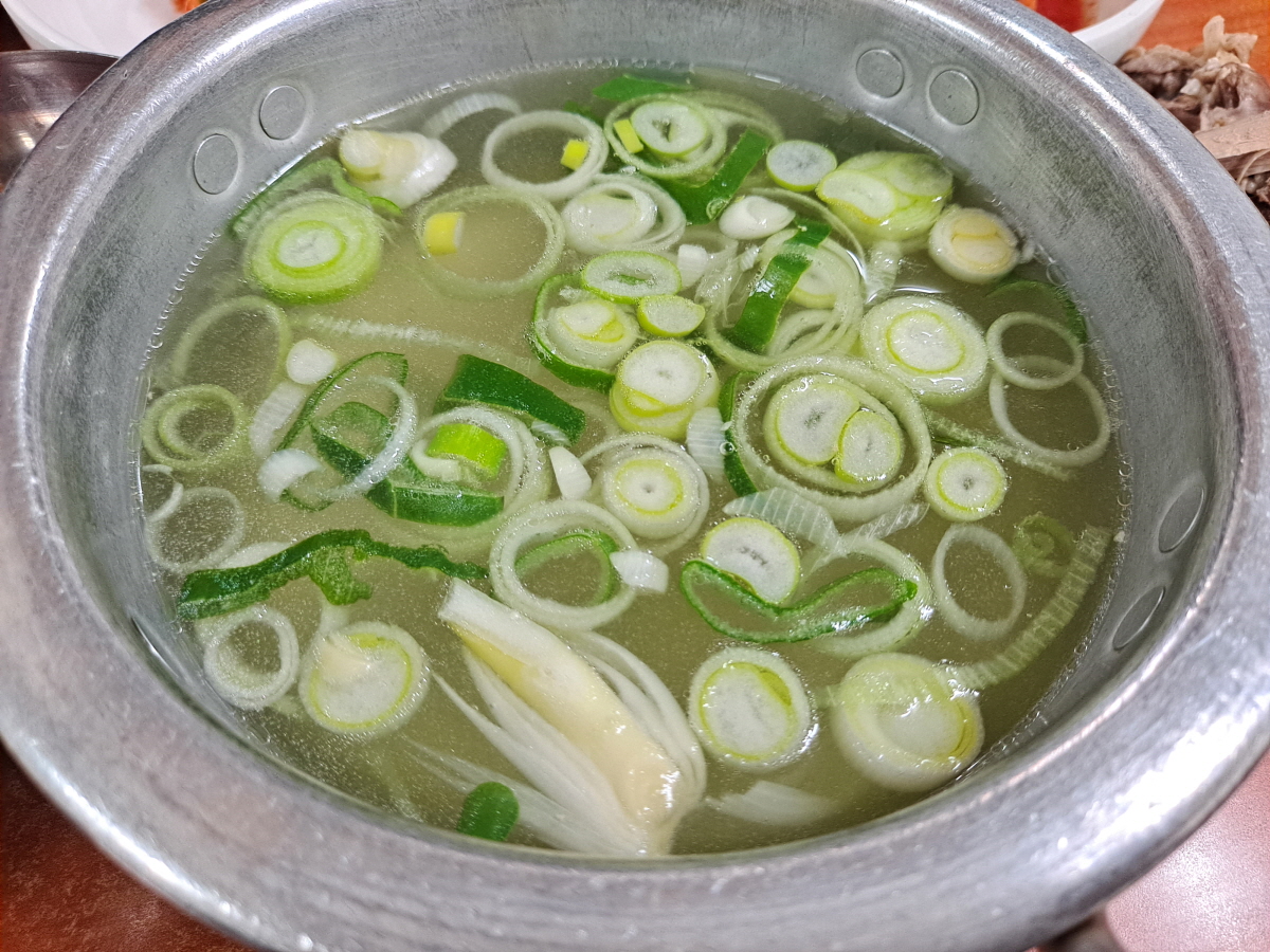 국밥 냄비 위에 닭 육수에 토렴 한