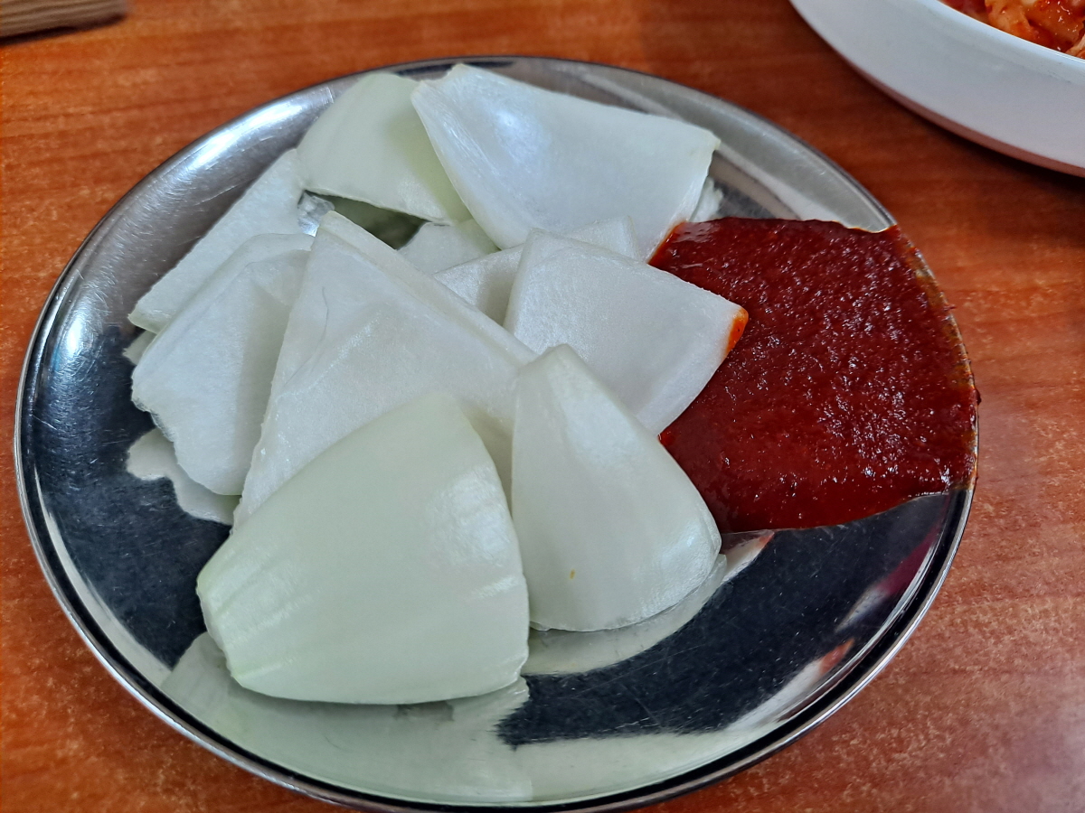 큼직하게 썰어놓은 생양파가 나옵니다.