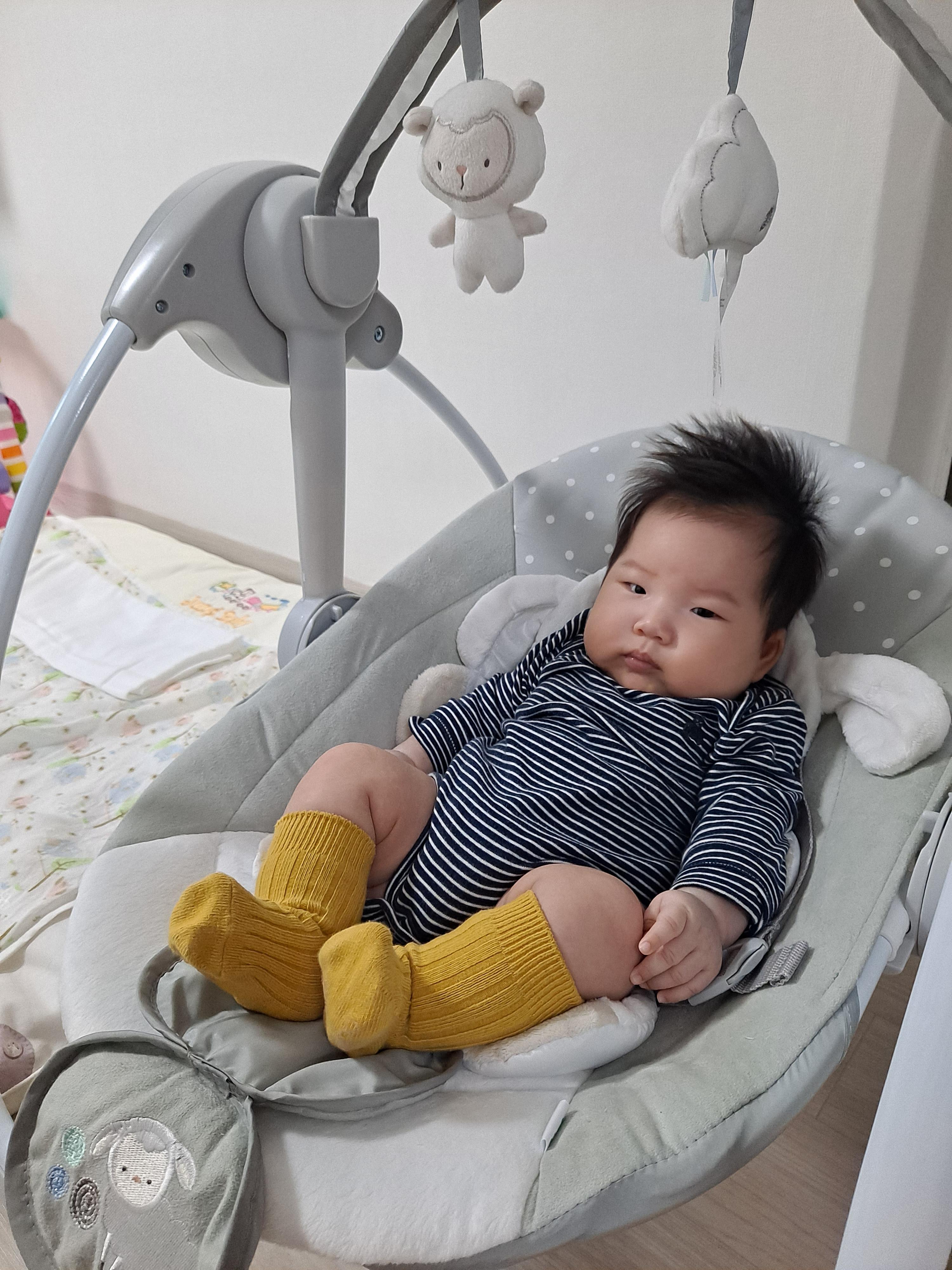 아기는 바운서에 태워놓고 식사를 했습니다.