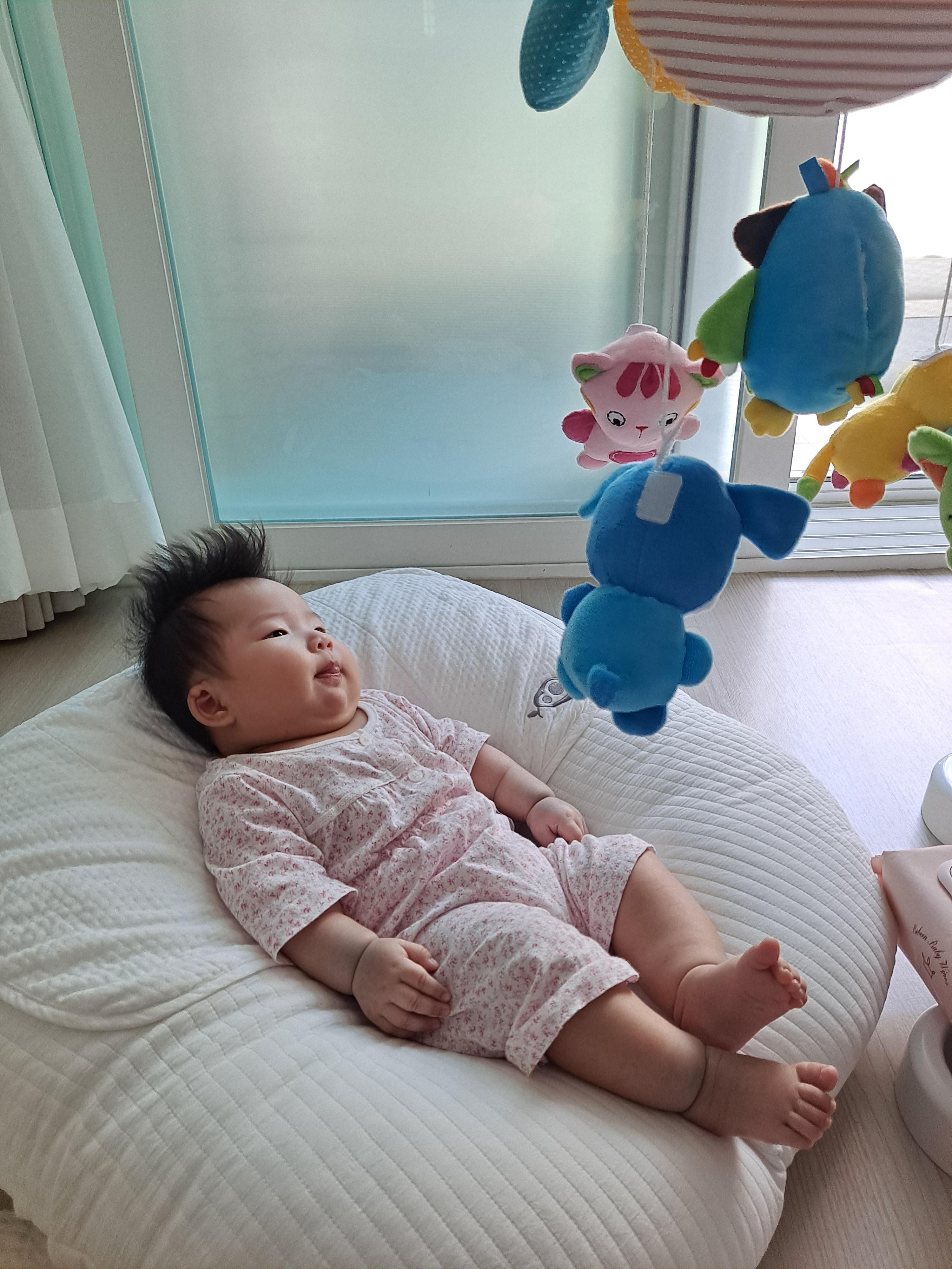 아기가 모빌에 집중하고 있는