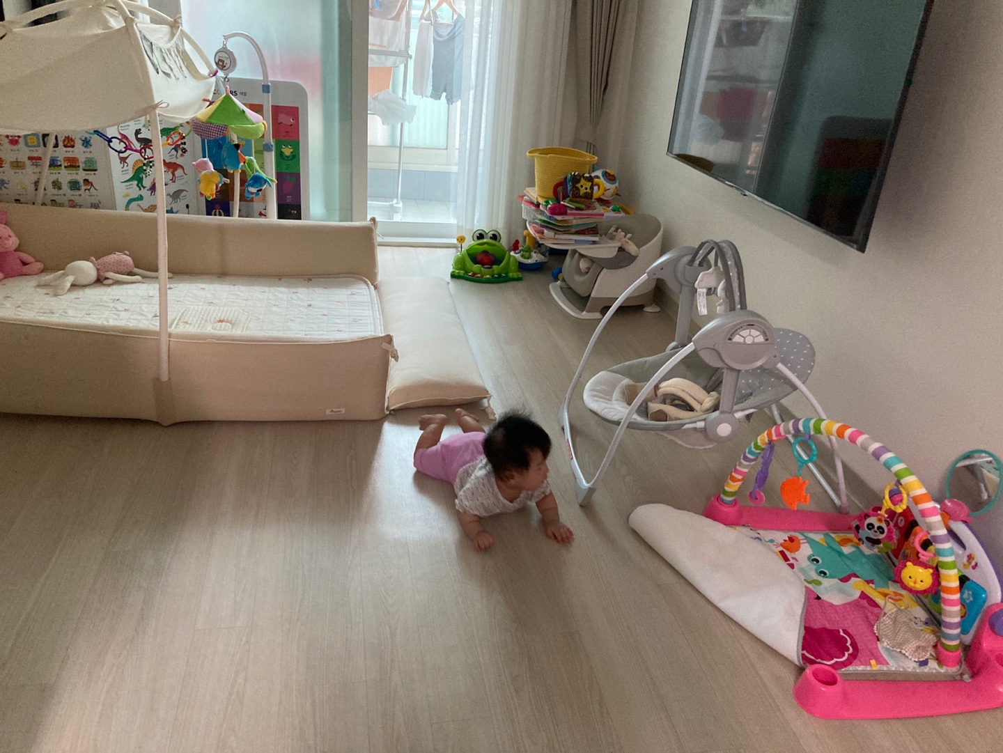 자유롭게 거실을 탐험하고 있는 아가의 모습인데,
