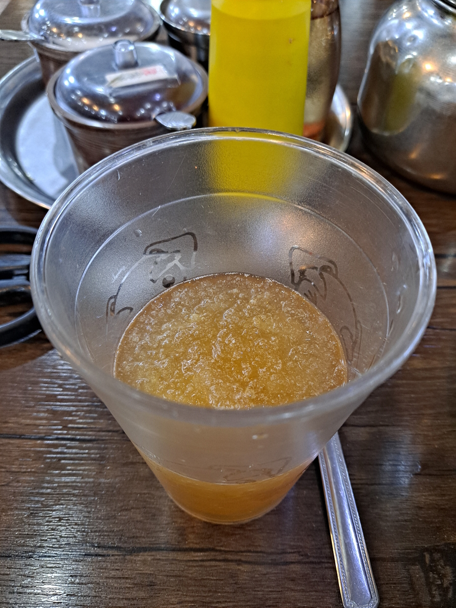 컵에다가 얼음 가득한 냉면 육수를 가져다준다.