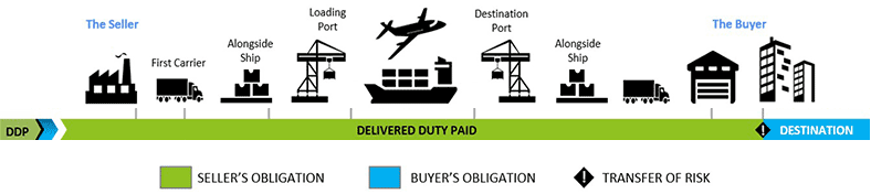 보통 수출국의 매도인이 지정한 포워더가 수출국 화물 픽업부터 수입국의 도착지 최종 배송 및 세금 납부 업무까지 모든 국제운송 업무를 진행 후 모든 비용을 매도인에게 일괄 청구합니다. 즉 물건을 파는 사람이(포워더를 시켜서) 알아서 사는 사람에게 까지 화물을 가져다주는 조건으로 보통 매도인이 포워딩 업체를 선정합니다. EXW조건과 반대되는 조건이라고 보면 됩니다.