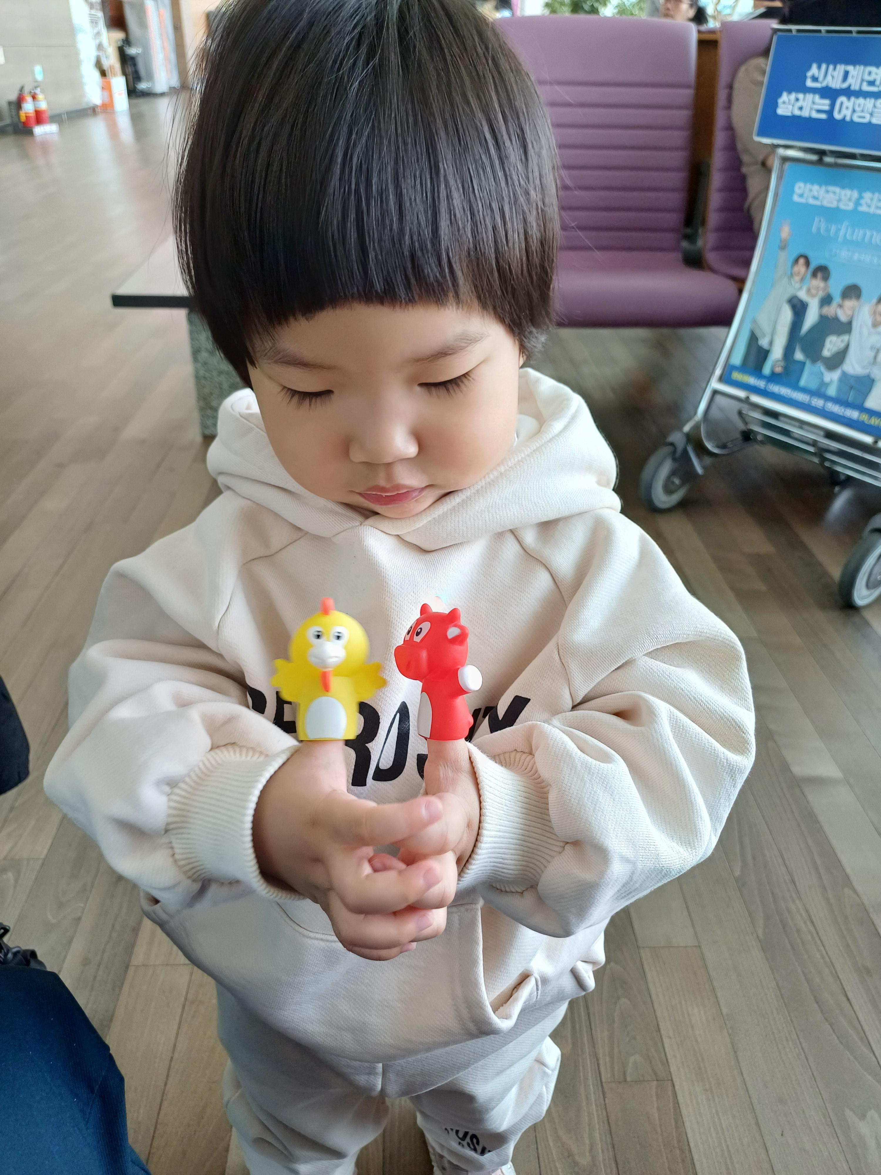-다이소에 가서 천원짜리 뽀로로 스티커를 여러 장과 부피가 작은 캐릭터 인형 장난감도 구매를 했습니다. 평소에 잘 보는 작은 사이즈의 책도 추가로 몇 권 챙겨놨습니다. 구매한 장난감들은 미리 보여주지 않고, 비행기 탑승 후 보여줘서 신선함을 느낄 수 있도록 해줬습니다.