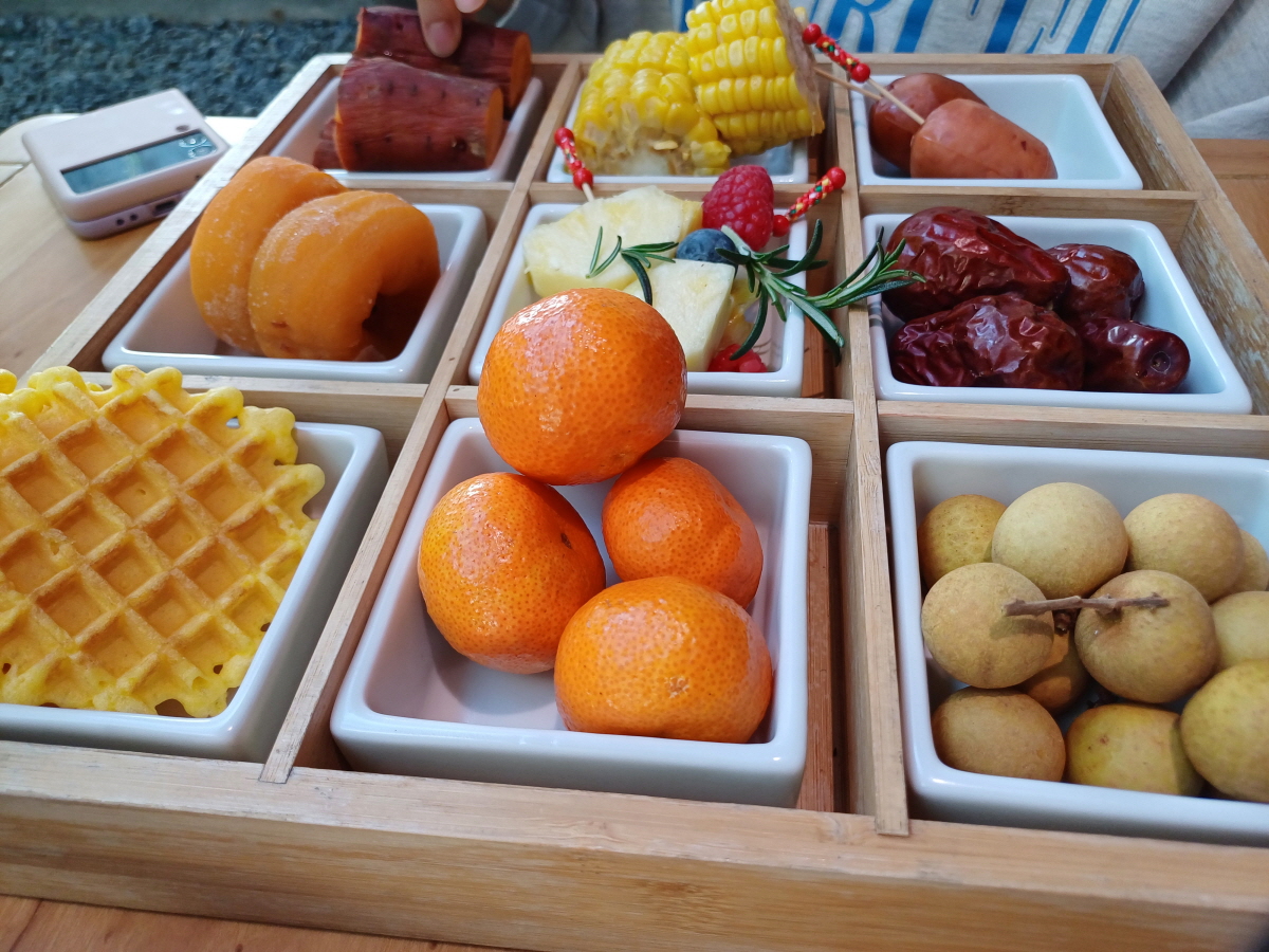 9종류의 다과가 나왔다. 고구마, 옥수수, 소시지, 감, 파인애플, 대추, 와플, 귤, 리즈로 구성되어 있다.