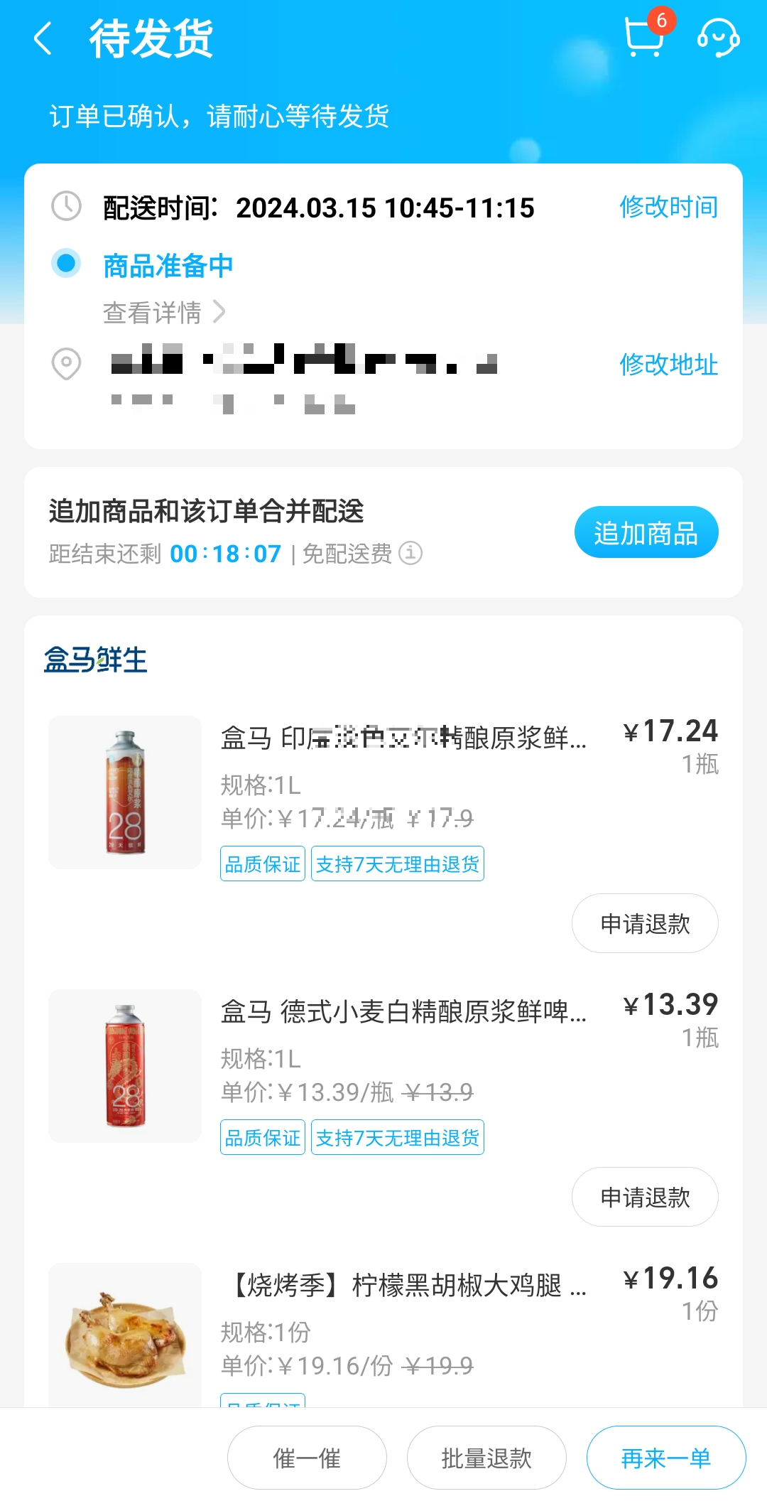 주문 및 결제 완료 후 예상 배송 시간이 뜨고, 상품이 배송 개시되기 전 까지는 추가로 물건을 추가할 수 있는 시간이 주어진다. 깜박하고 구매를 놓친 제품이 있을 때 유용하게 사용할 수 있는 기능이다. 배송기사가 배송을 시작하면 실시간 위치와 도착 예정시간이 나오며 배송 상황을 정확하게 안내해 준다.