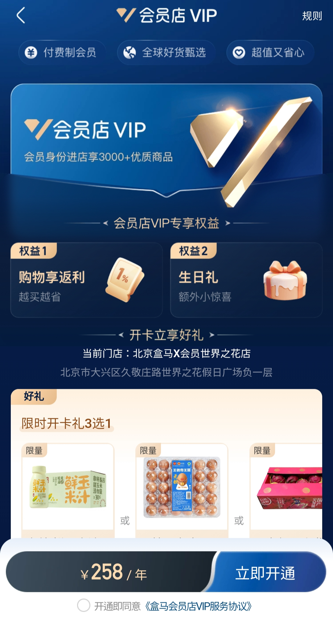 년 258위안(한화 약 47,000원 정도) 지불하면 년간 회원 가입이 가능하고, 회원 가입 시 여러 가지 혜택이 주어진다. 가입선물, 생일선물, 포인트 적립 등 다양한 혜택이 있어 이용 빈도가 빈번할 경우 연간회원 가입 시 여러모로 유리하다.