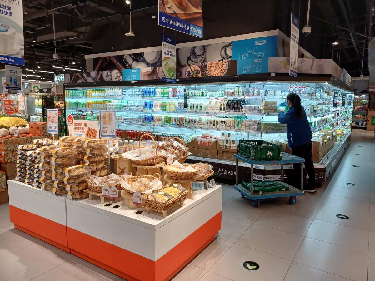 허마선생 조끼를 입은 직원들이 장바구니를 들고 돌아다니면서 주문받은 제품들을 손수 담고 있다. 매장 위에 움직이는 컨베이어 라인이 인상적이다.