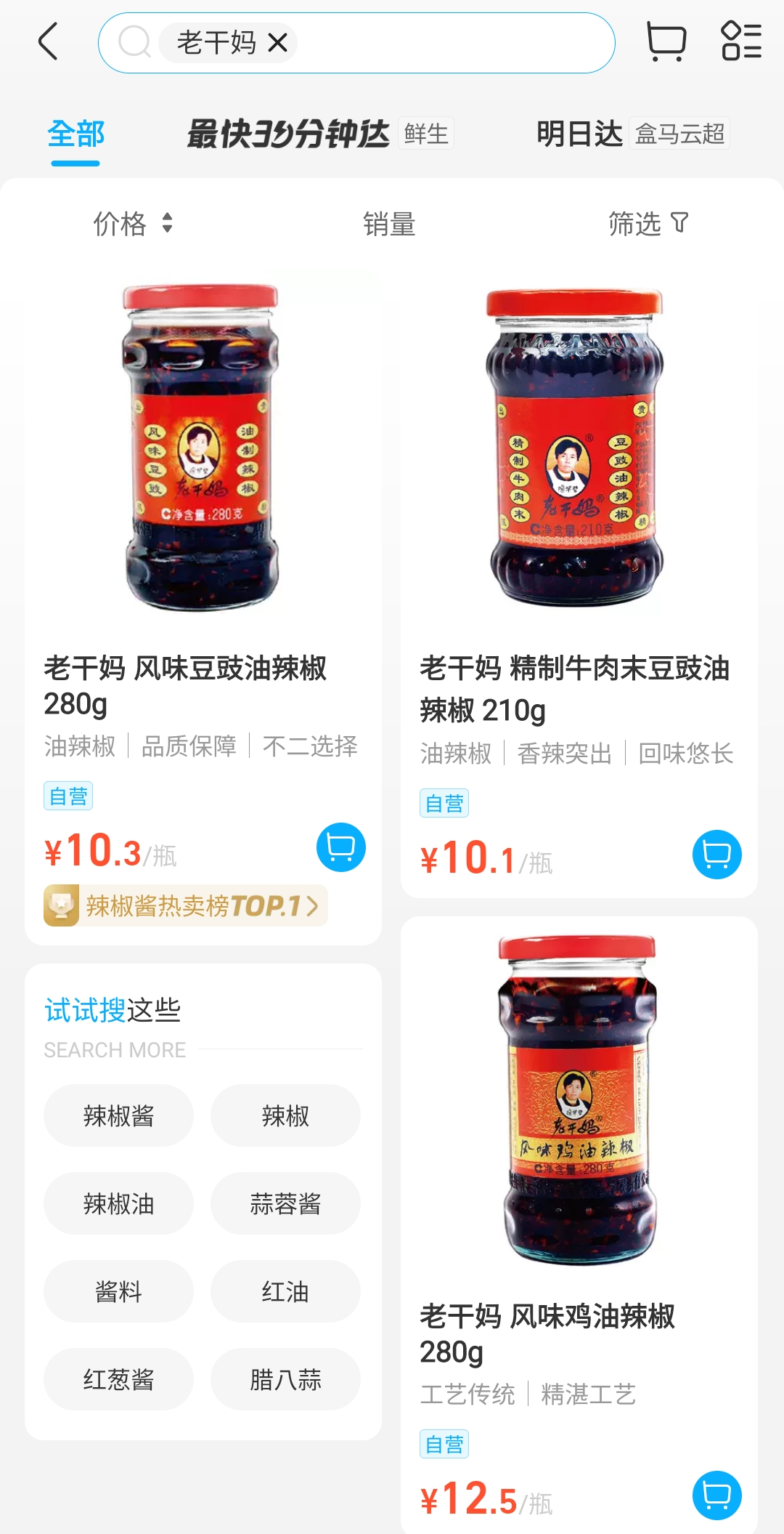 허마센셩 어플에 라오깐마로 검색을 하면 총 3가지 종류의 라오깐마가 검색이 된다.