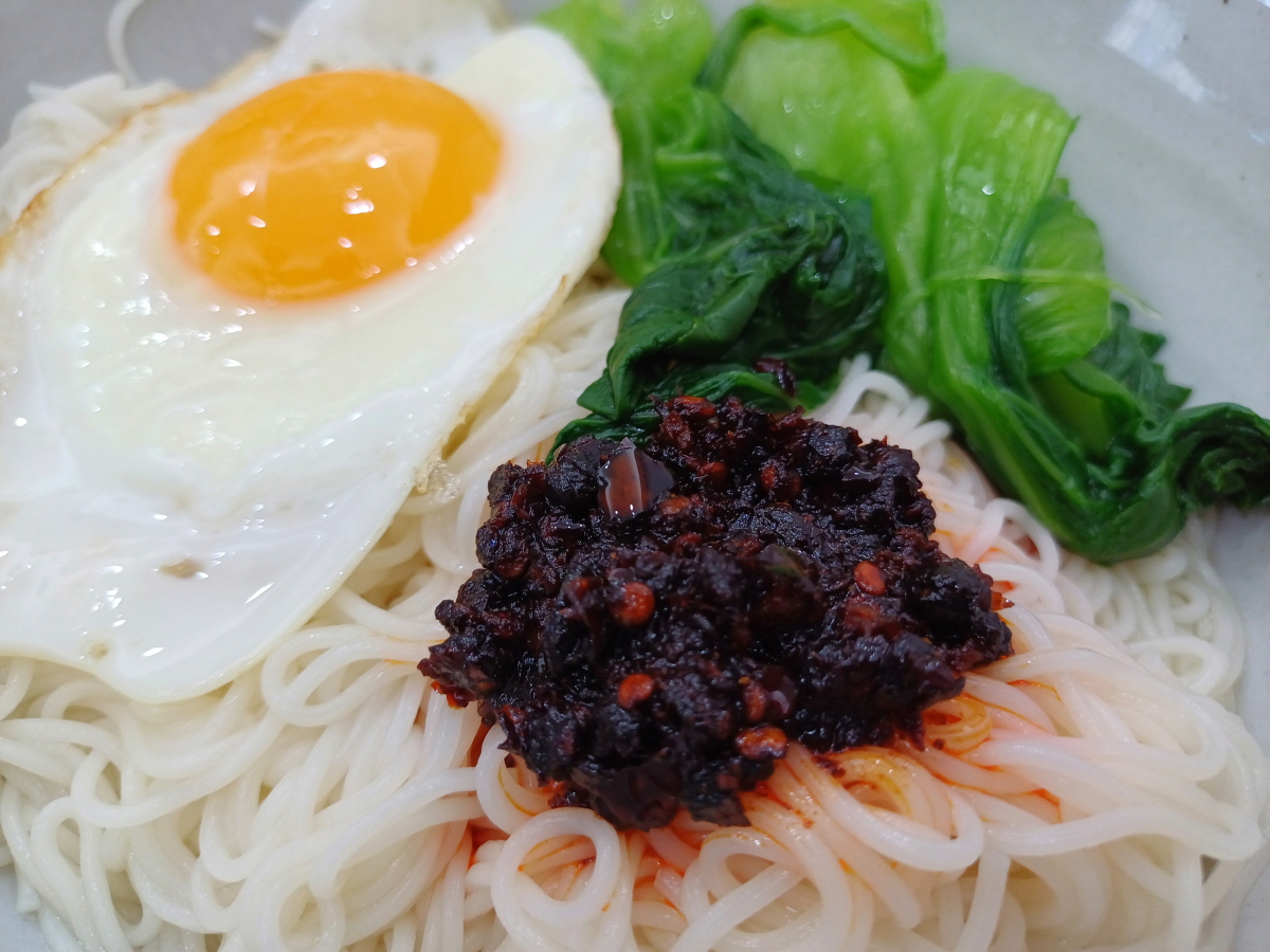 라오깐마를 구매한 후 약 15년 전 중국 친구들과 함께 먹었던 방식 그대로 그냥 국수만 삶은 뒤 달걀 후라이와 데친 청경채만 올려서 쓱싹 비벼서 먹어봤다.