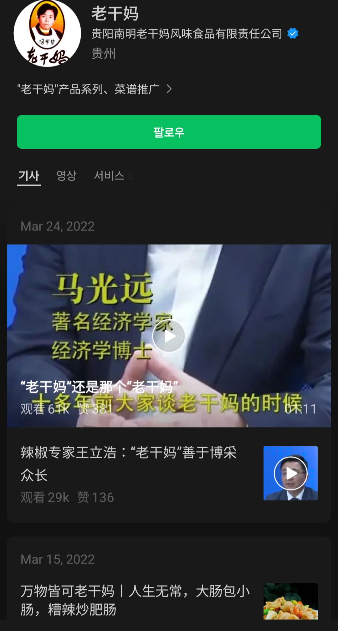 제품 상표에 나와 있는 QR코드를 위챗으로 스캔하면 라오깐마 위챗 공중계정으로 연결 가능하며 이곳에서 다양한 요리 레시피 확인이 가능하다.