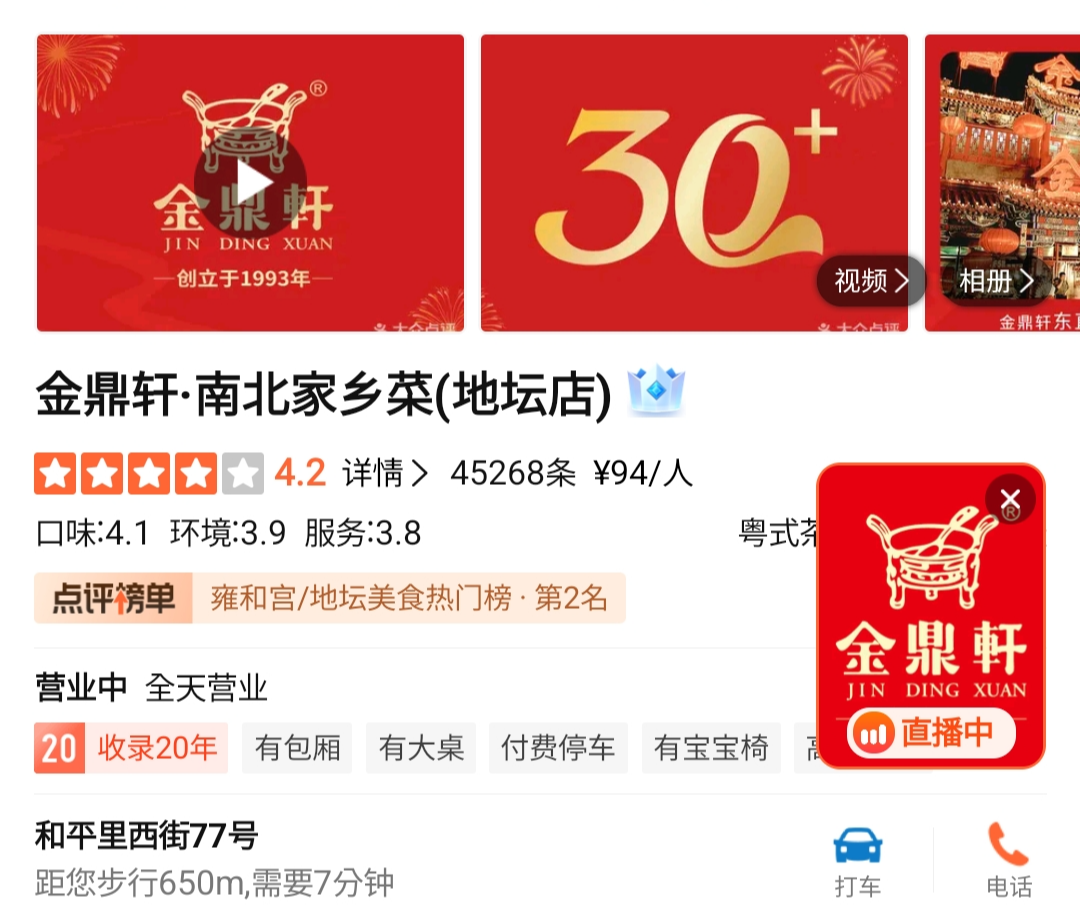 금정헌은 옹화궁에서 걸어서 약 5~10분 정도면 도착 가능한 거리에 있는 로컬 딤섬 맛집으로 북경에 여러 체인점을 운영하고 있는 대형 식당으로, 1993년에 설립되어 북경에서 24시간 영업의 개념을 최초로 개척한 최초의 요식업 기업이다.