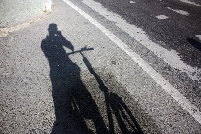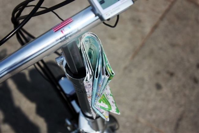 자전거 가방을 살 여유가 없으므로, 카메라 가방을 신발끈으로 묶었다.