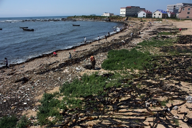 해변가에 가보니 수많은 사람들이 해안가로 밀려온 미역을 건지고 있다. 사방이 미역이네,,