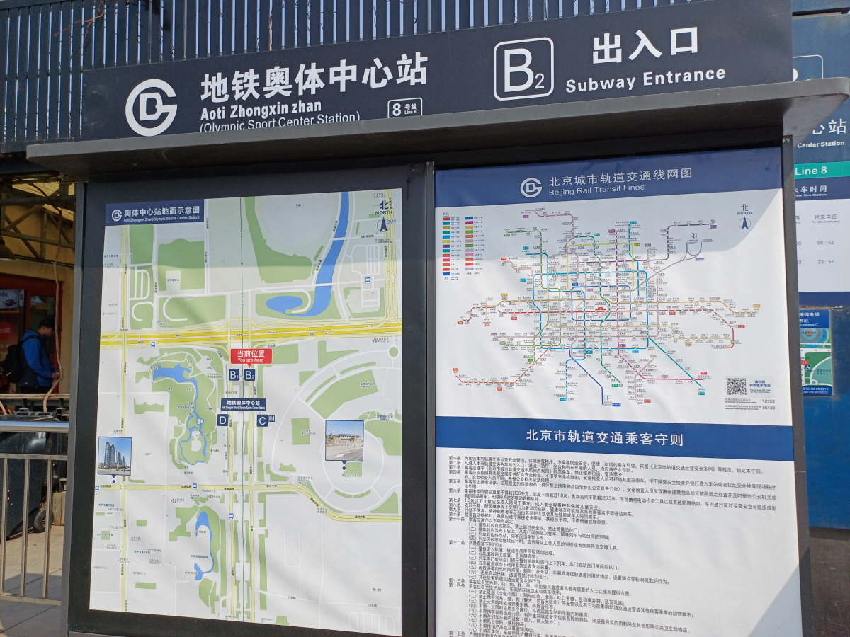 북경 올림픽 공원의 경우 북쪽에는 삼림공원이 위치하고 있고 남쪽에는 올림픽 주 경기장이 있는 올림픽 체육 중심 구역으로 나눠지는데, 북경 지하철 8호선 올림픽스포츠센터(奥体中心) 역에서 내리면 공원 남쪽에서부터 올라가면서 공원을 전체적으로 관람할 수 있다.