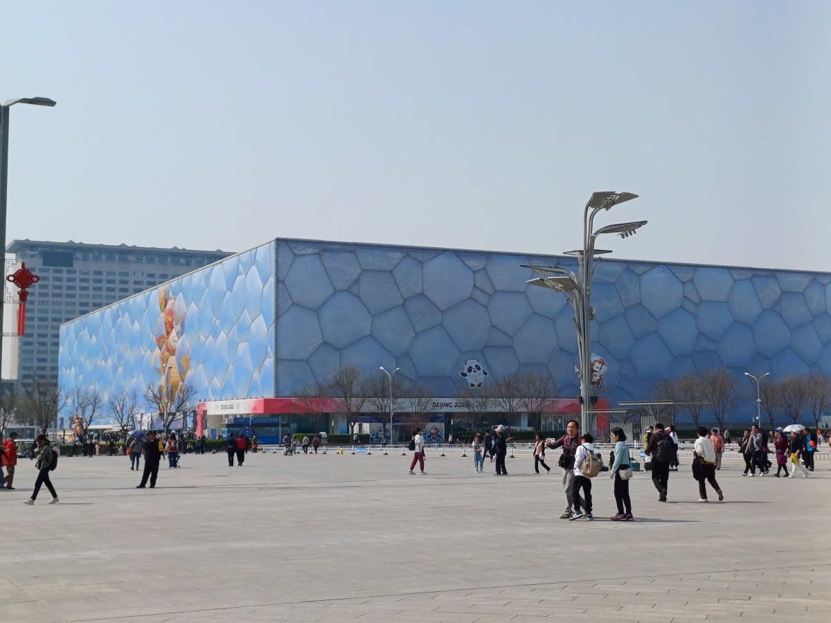 맞은편에는 2008년 하계 올림픽의 수영경기, 2022년 동계올림픽의 컬링 경기가 개최되었던 수영장인 워터큐브(水立方)이 자리 잡고 있다.