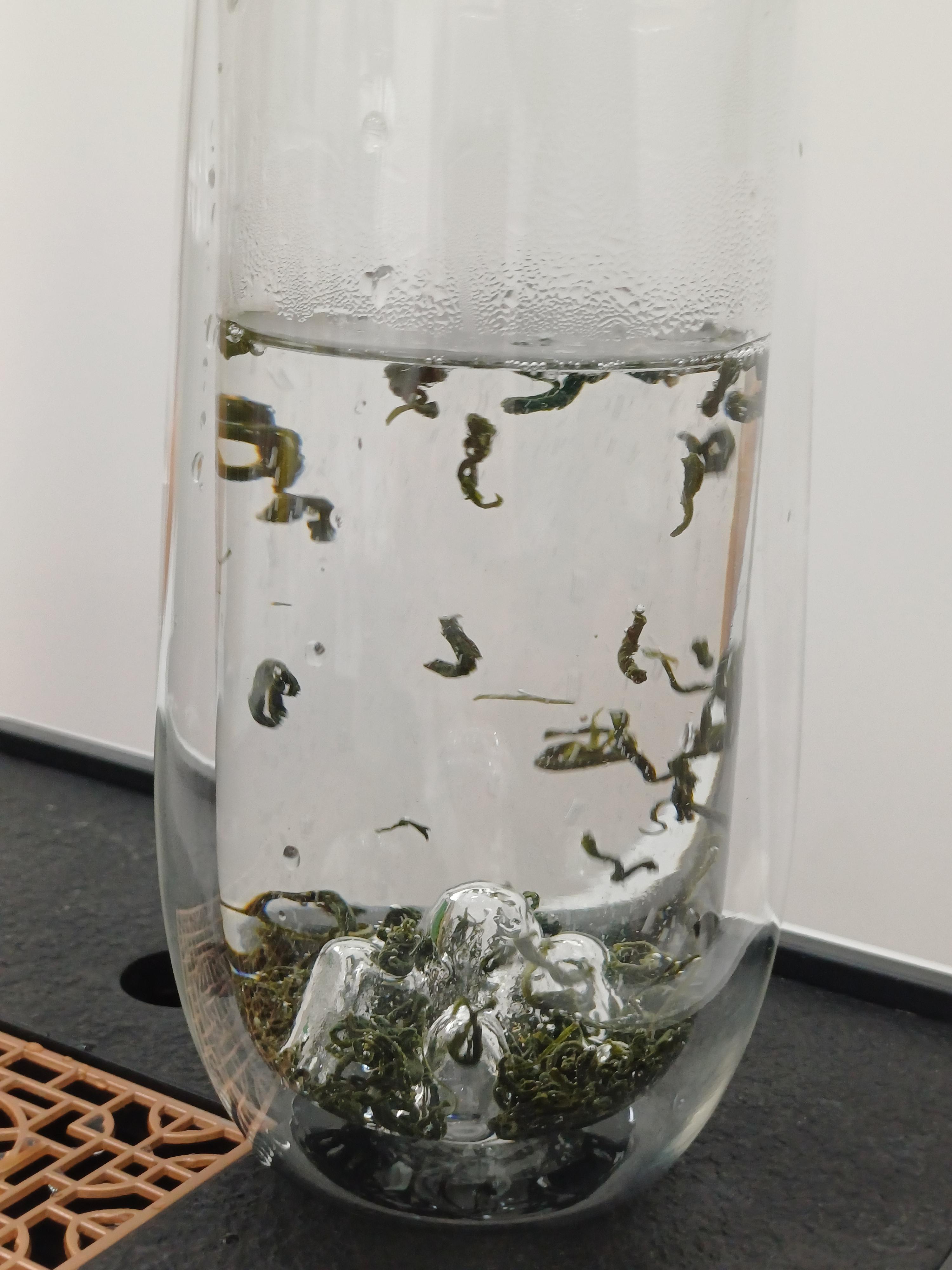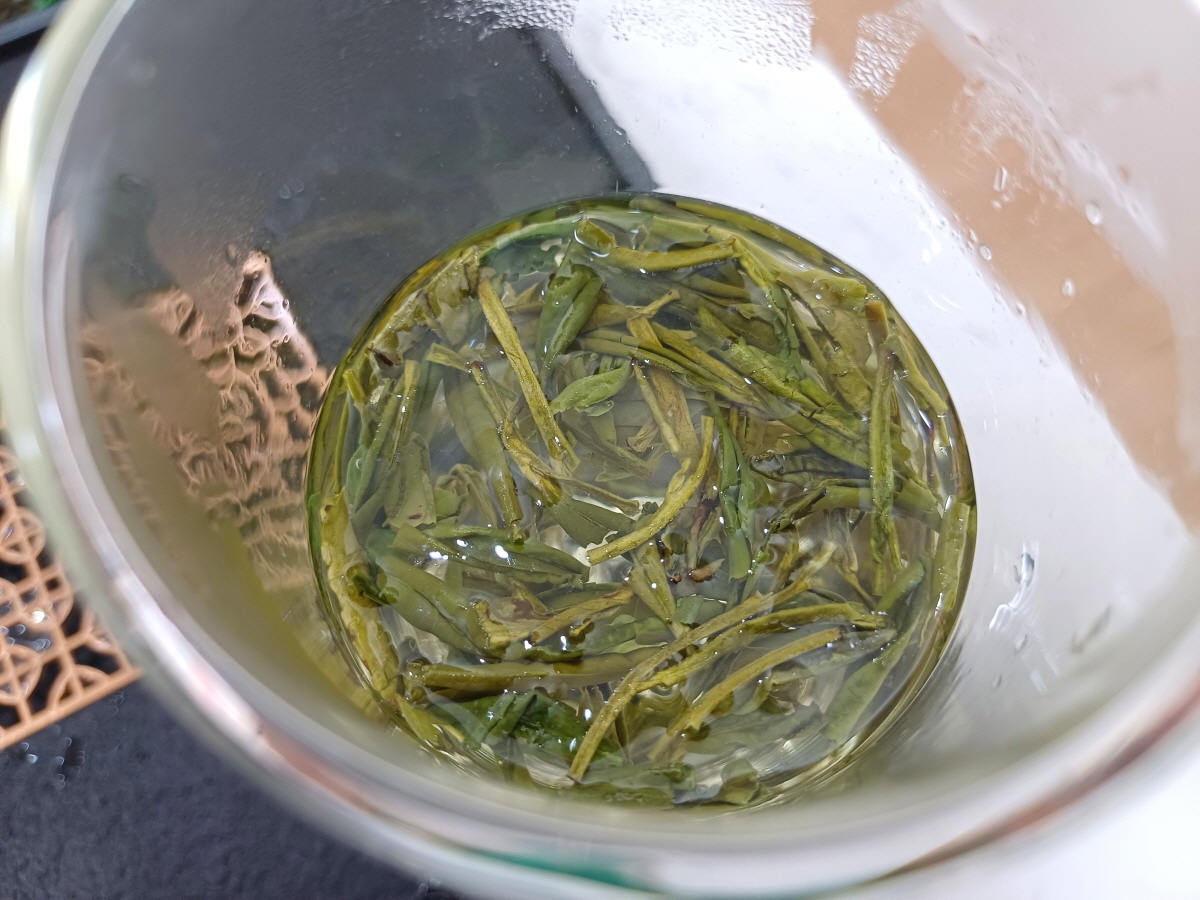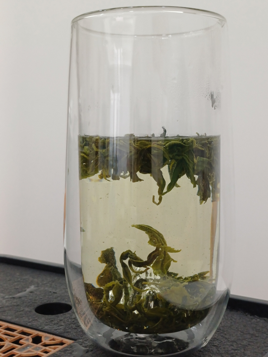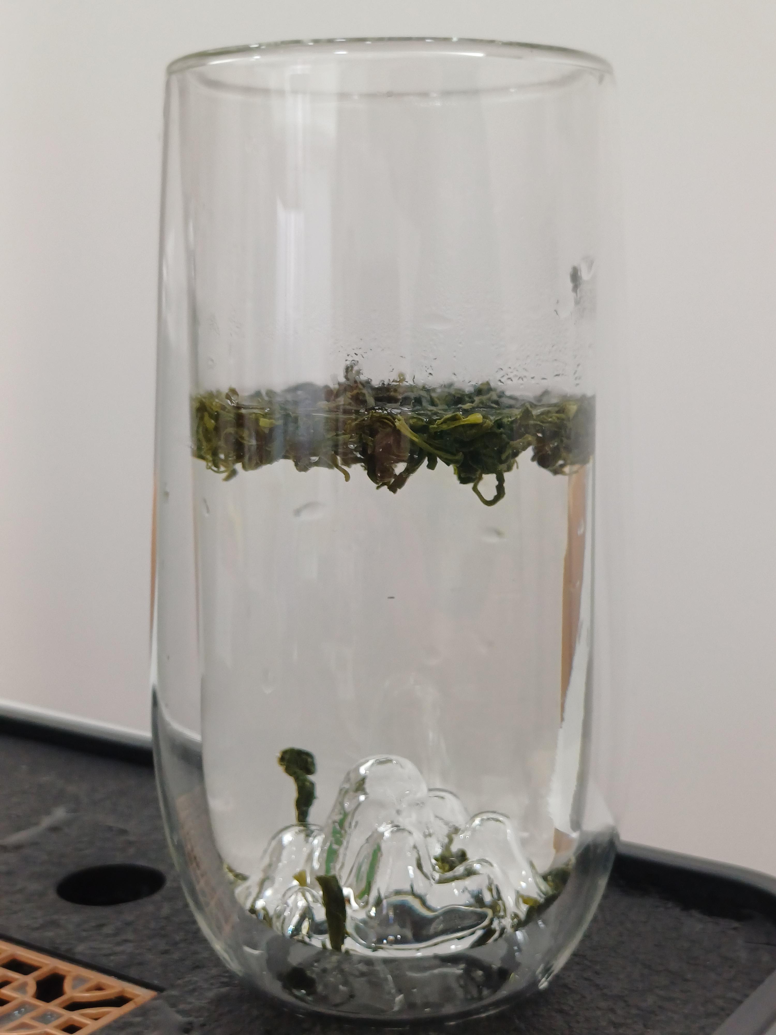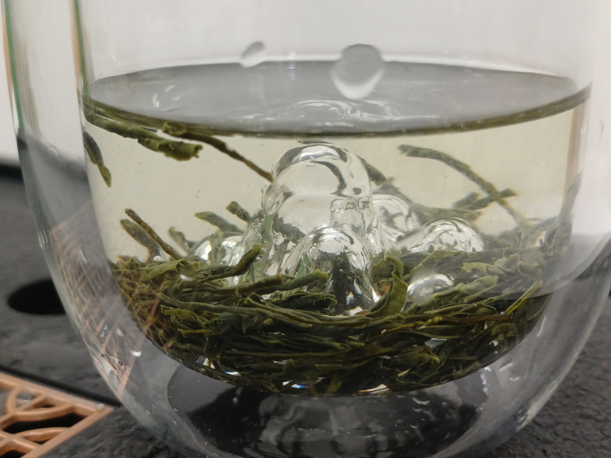 녹차 전용 유리잔에 하투법(찻잔에 찻잎을 넣고 소량의 물을 넣어 찻잎을 적신 후 찻잎이 퍼지면 다시 7할까지 물을 넣는 방식)으로 우려 본다.