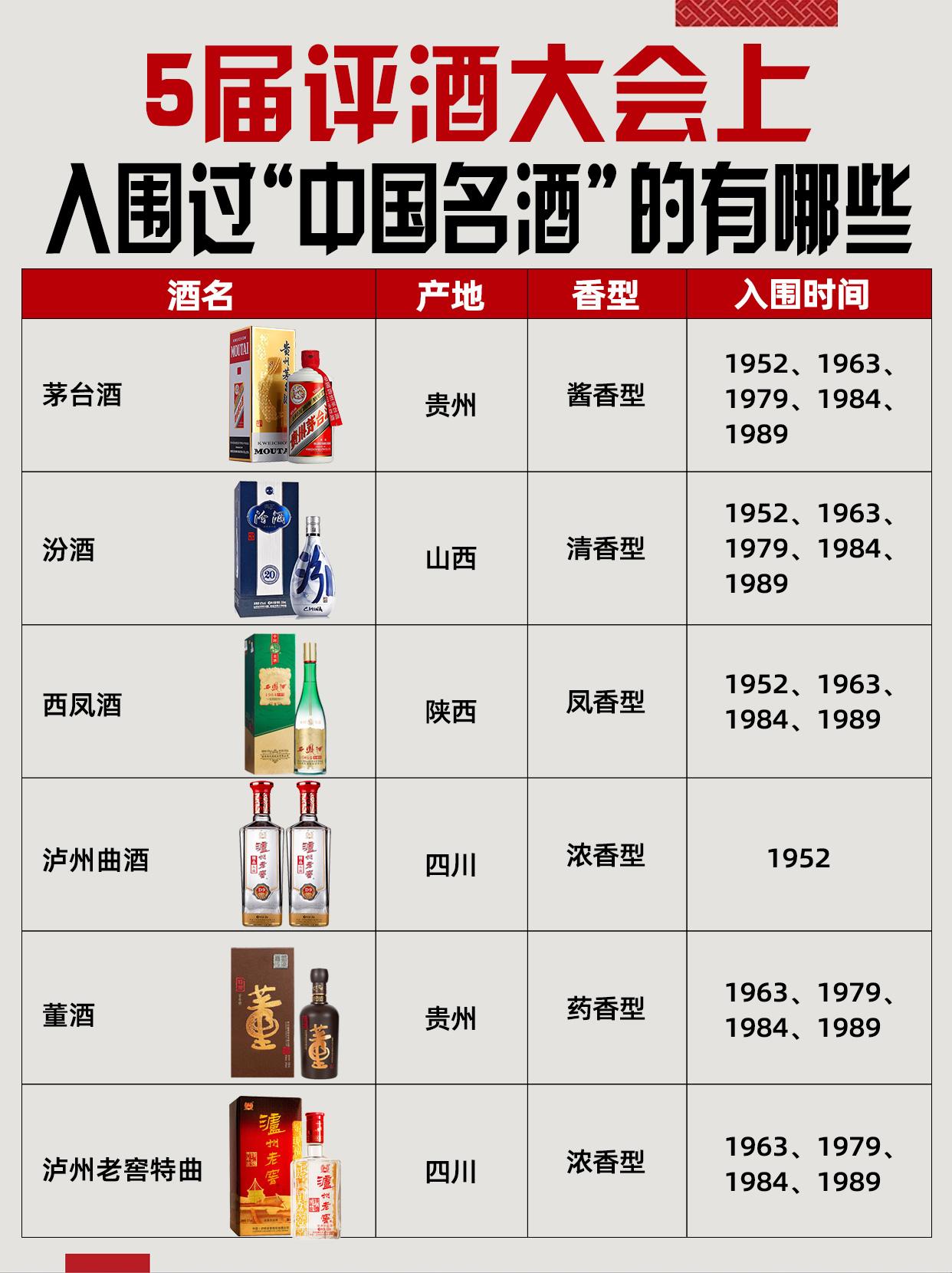 # 오량액(五粮液)의 경우 전란으로 생산중단 중이었으며, 1952년에 다시 생산재개를 하였기 때문에 참여하지 못함.