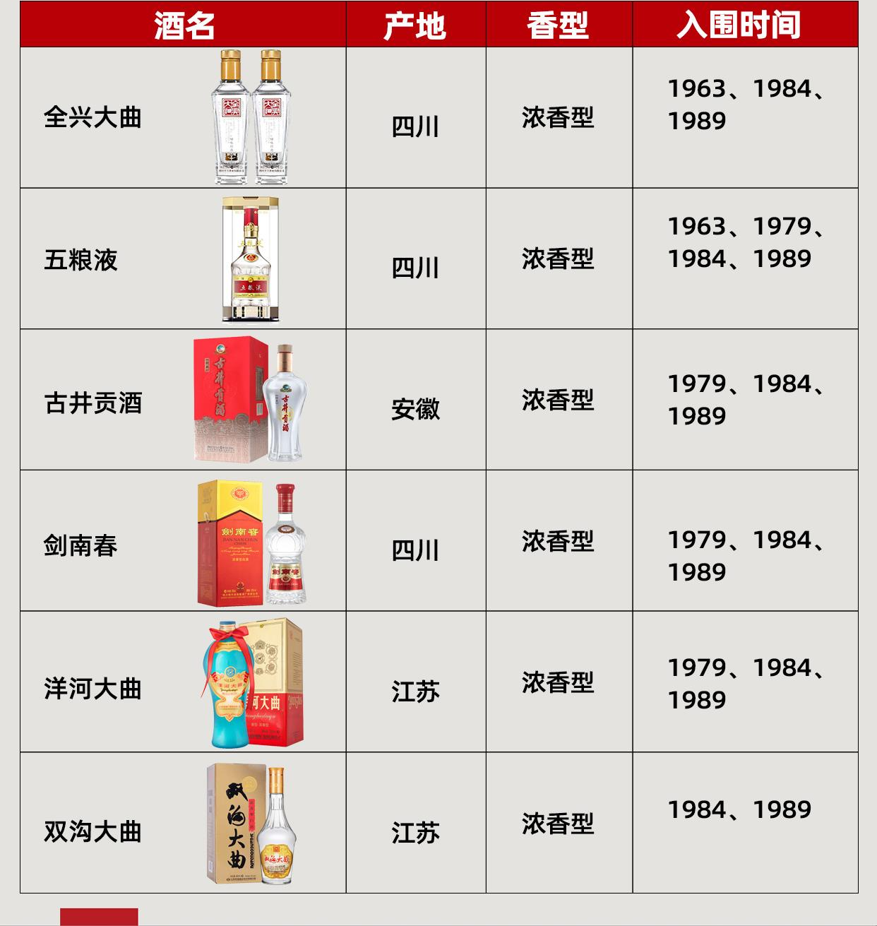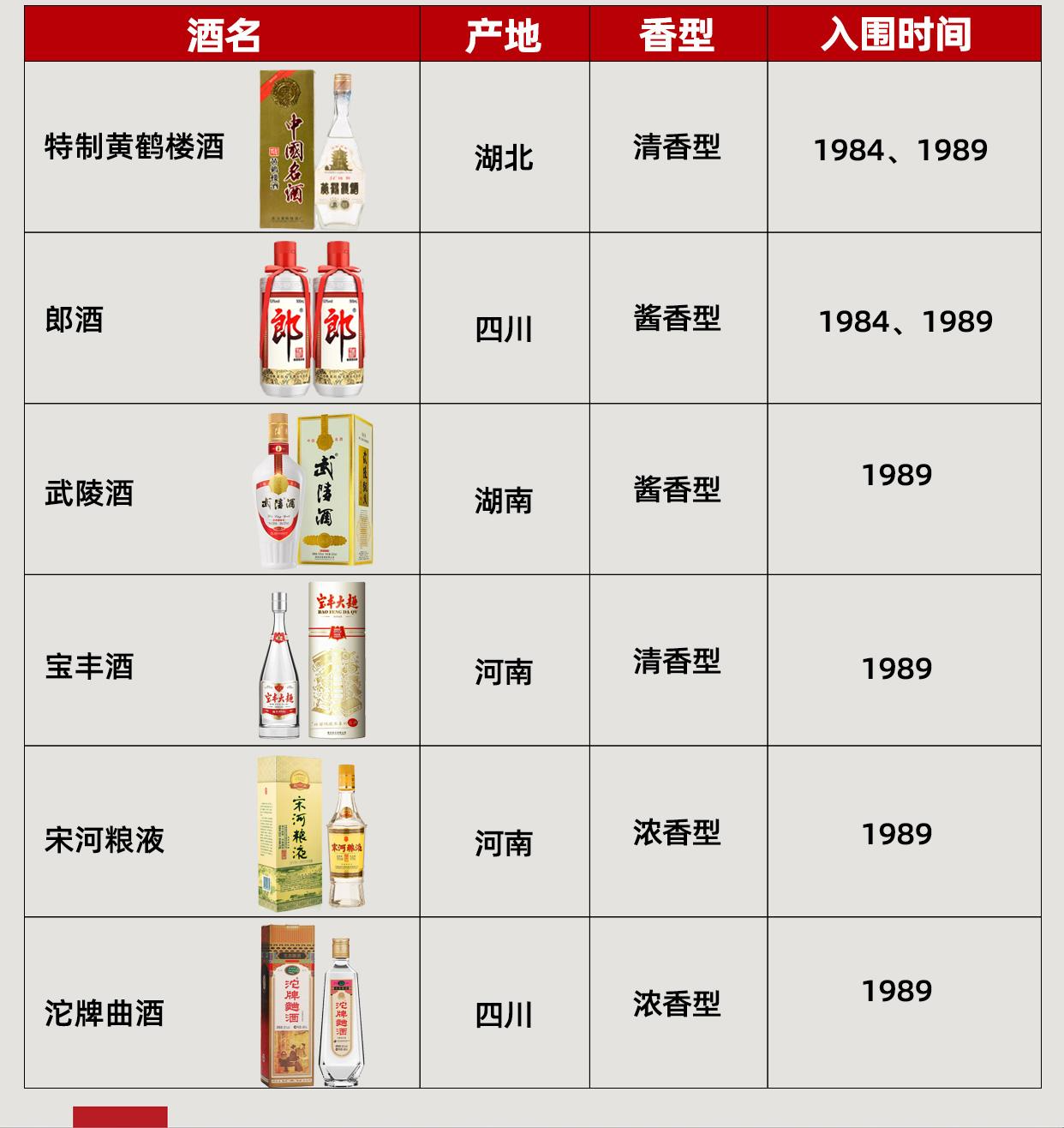 -백주류 9종 : 쌍구대곡주(双沟大曲酒), 용빈주(龙滨酒), 덕산대곡주(德山大曲酒), 계림삼화주(桂林三花酒), 창주서간백주(沧州薯干白酒), 하얼빈고랑강백주(哈尔滨高粱糠白酒), 전주상산주(全州湘山酒), 능천백주(凌川白酒), 합비서간백주(合肥薯干白酒)