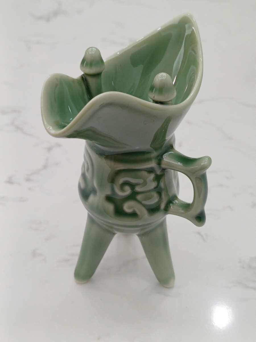 청자 도자기처럼 영롱한 푸른색을 띠고 있었으며, 도자기 재질로 되어 있지만 금속 전통잔의 모양은 잘 묘사되어 있다.