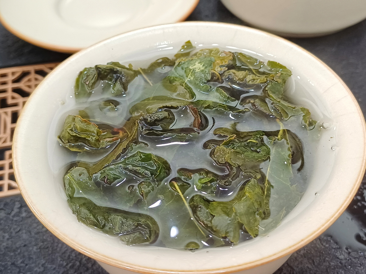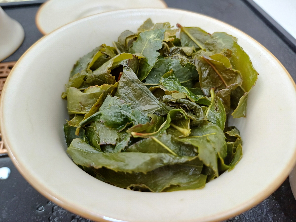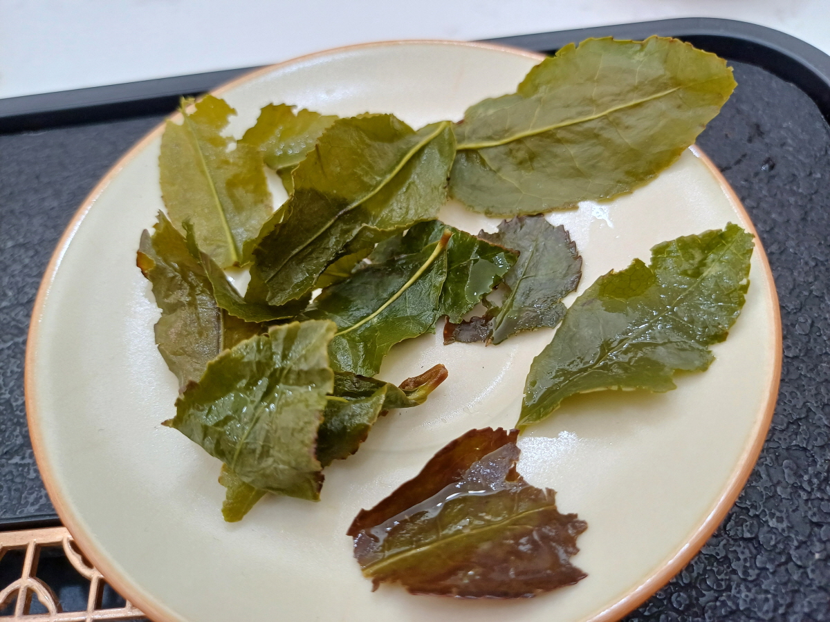 우려낸 찻잎을 따로 펼쳐서 감상을 해봤다. 대부분 단엽(单叶)으로 구성되어 있었으며, 우롱차의 특징인 우려낸 찻잎의 가장자리가 붉은색을 띠는 녹엽홍상변(绿叶红镶边)의 모습도 관찰이 가능했다.