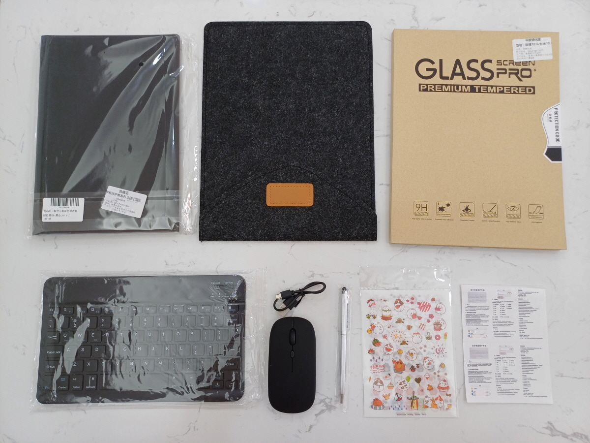 블루투스 키보드와 보호케이스가 기본 세트로 구성되어 있었으며, 증정품 5가지(강화필름, 블루투스 마우스, 파우치, 스티커, 전용펜)를 준다.