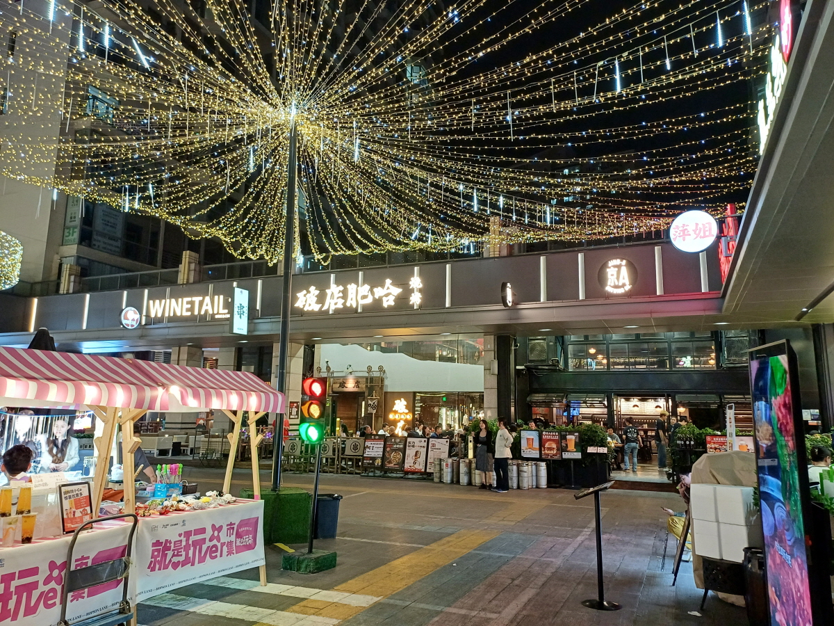 쇼핑몰 건물 주위에 형성되어 있는 식당 거리, 노상에서 음식과 술을 마실 수 있는 식당과 술집들이 즐비하다.