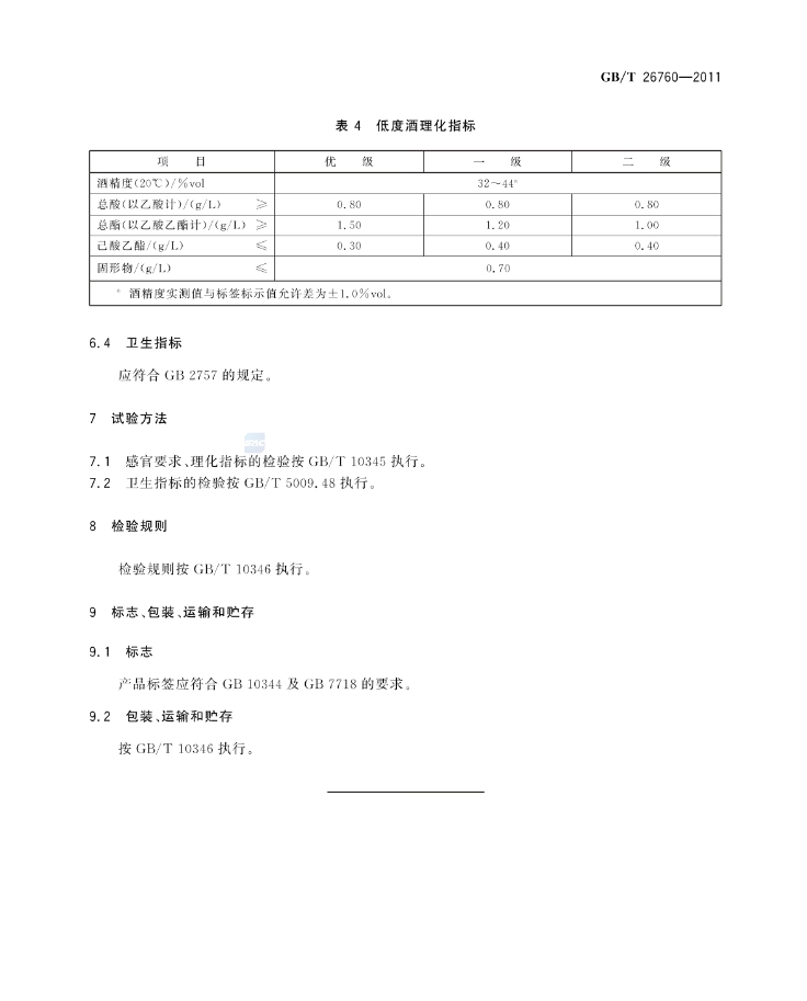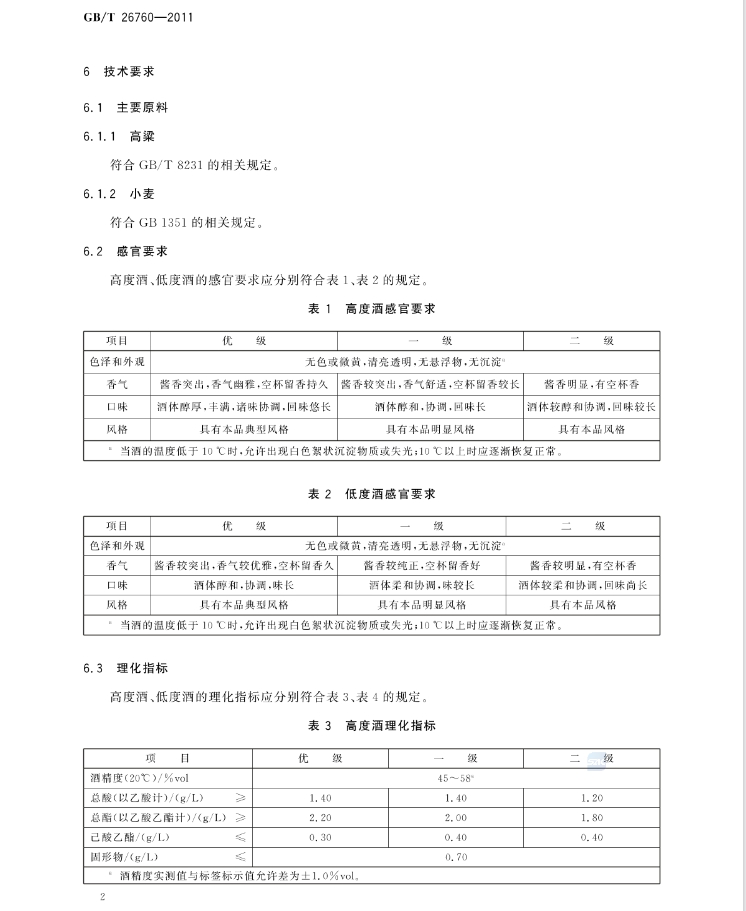 보고서 형식으로 장항형백주의 국가표준 요건 내역들이 아주 상세하게 기술되어 있다. 원료 기준도 세부적으로 기술하고 있으며, 고도수와 저도수 장항형 백주로 구분하여 감관(感官) 요구 사항, 화학적 요구사항의 명확한 기준을 제시하고 있다.