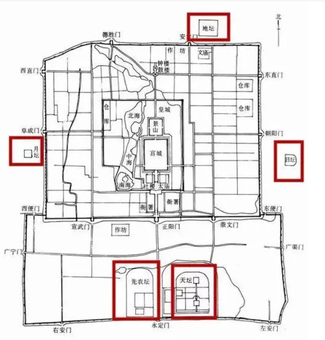 자금성을 기준으로 가장 북쪽에는 토지의 신에게 제사를 지내던 지단(地坛), 동쪽에는 태양신에게 제사를 지내던 일단(月坛), 서쪽에는 달의 신에게 제사를 지내던 월단(月坛), 남쪽에는 하늘신에게 제사를 지내던 천단(天坛)과 농사의 신에게 제사를 지내던 선농단(先农坛)이 위치하고 있다.