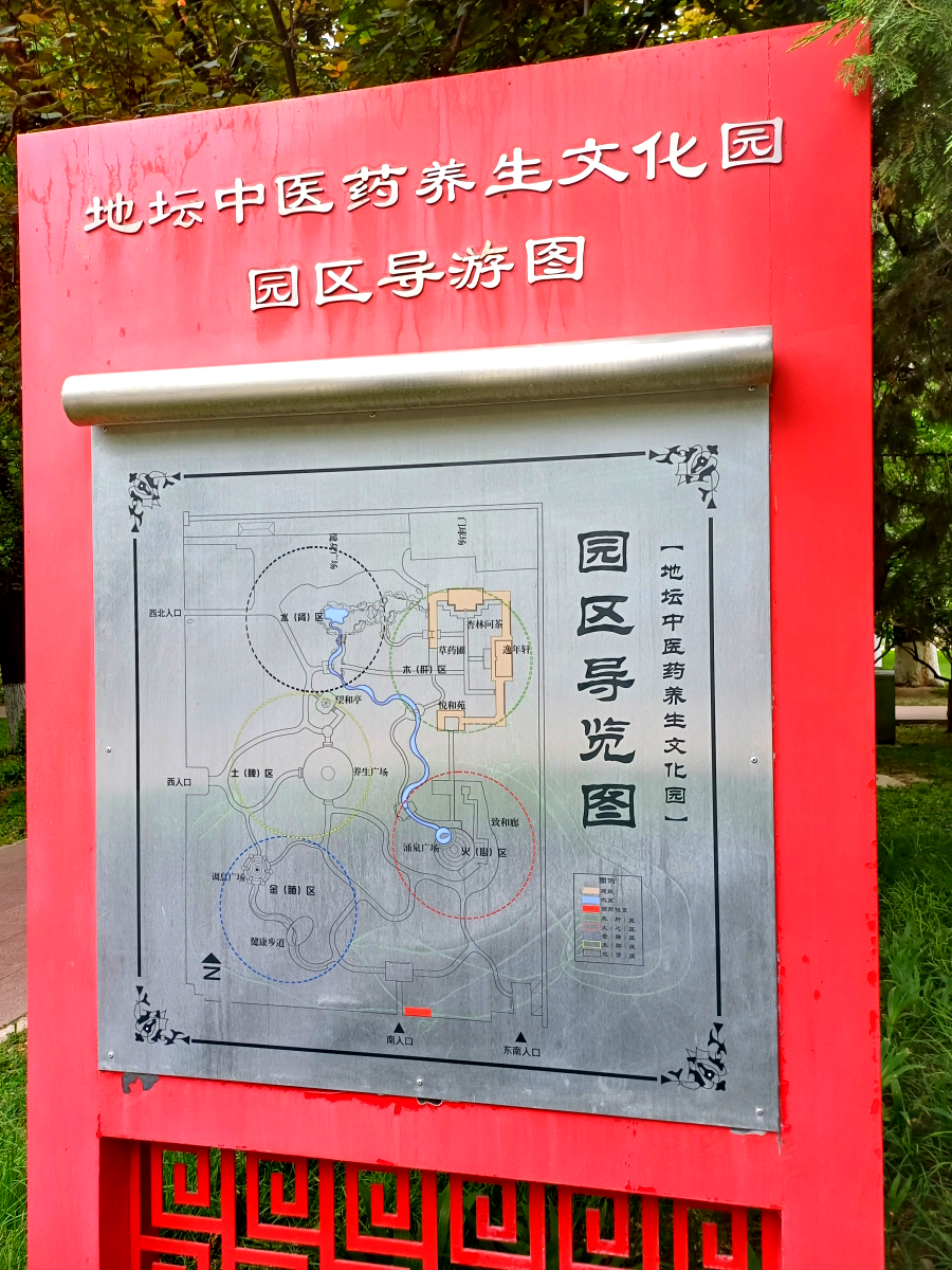 지단공원의 동북쪽으로 이동하니 '지단중의약양생문화원(地坛中医药养生文化园)'라는 곳이 나온다. 자세히 안내도를 살펴보니 화수목금토(火水木金土) 총 5곳의 구역으로 나뉘어 있다.