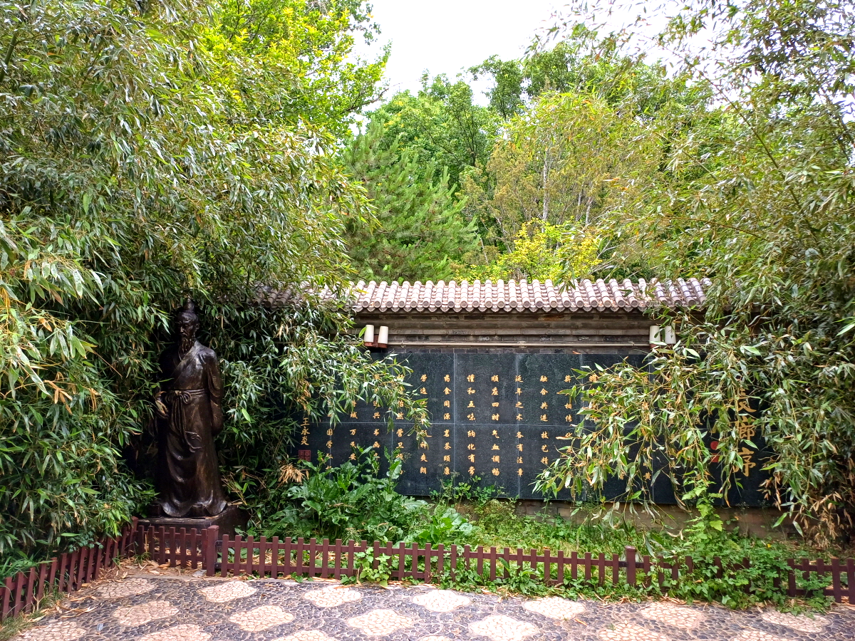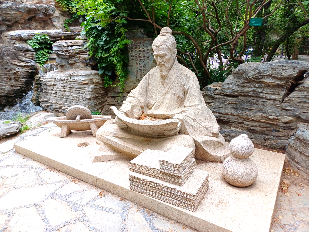 시원한 인공 폭포 옆에서 열심히 학문에 정진하고 있는 석상이 참 흥미롭다. 뒤에 비석에 적혀 있는 내용을 보니 당나라 시대의 도사, 의사, 연금술사, 의학자였던 손사막 (孙思邈)이라는 인물의 석상이었으며, 약왕(药王)으로 불릴 정도로 의술이 정말 대단했다고 한다.