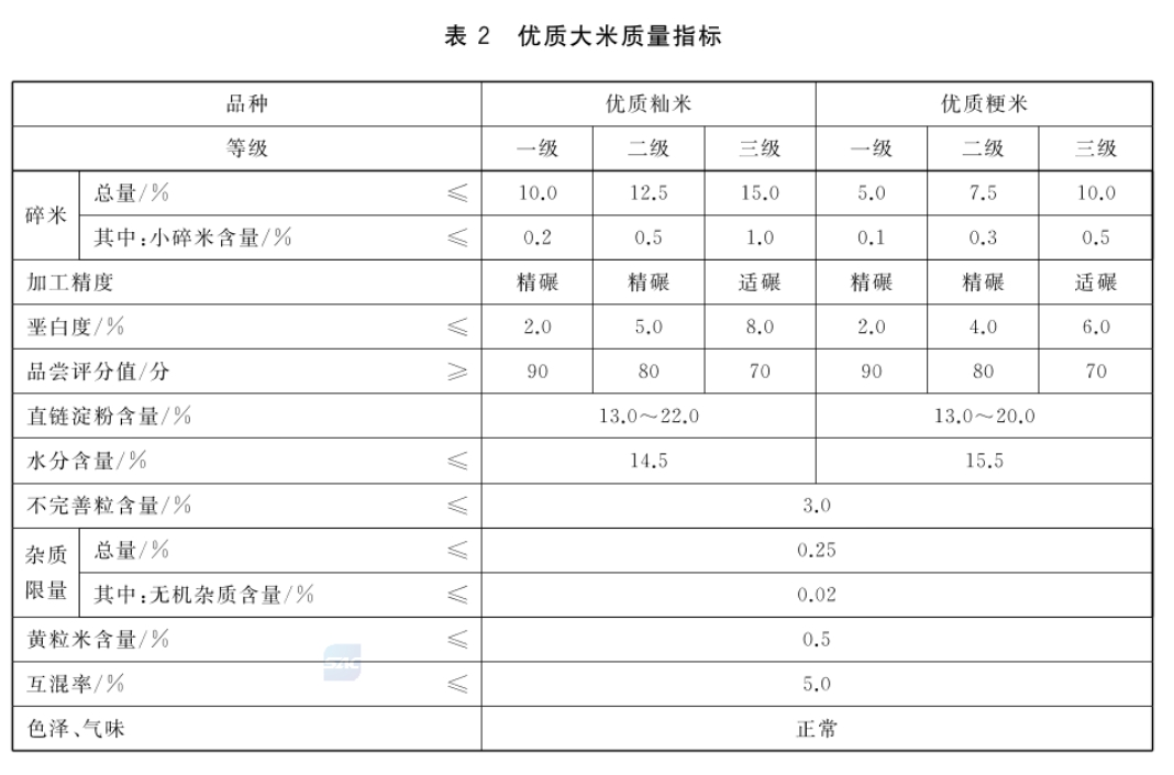 식용 품질에 따라 대미(大米)와 우질대미(优质大米)로 나뉘고 아래와 같은 기준에 따라서 등급을 나눈다.