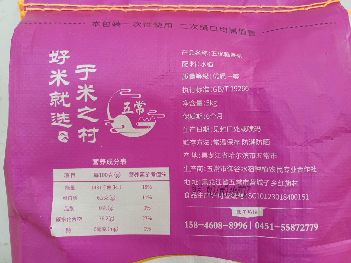 쌀 포장 뒷면을 살펴보니, 품명은 '오우도향미(五优稻香米)'이며, 산지는 흑룡강성(黑龙江省) 하얼빈시(哈尔滨市) 오상시(五常市)다.