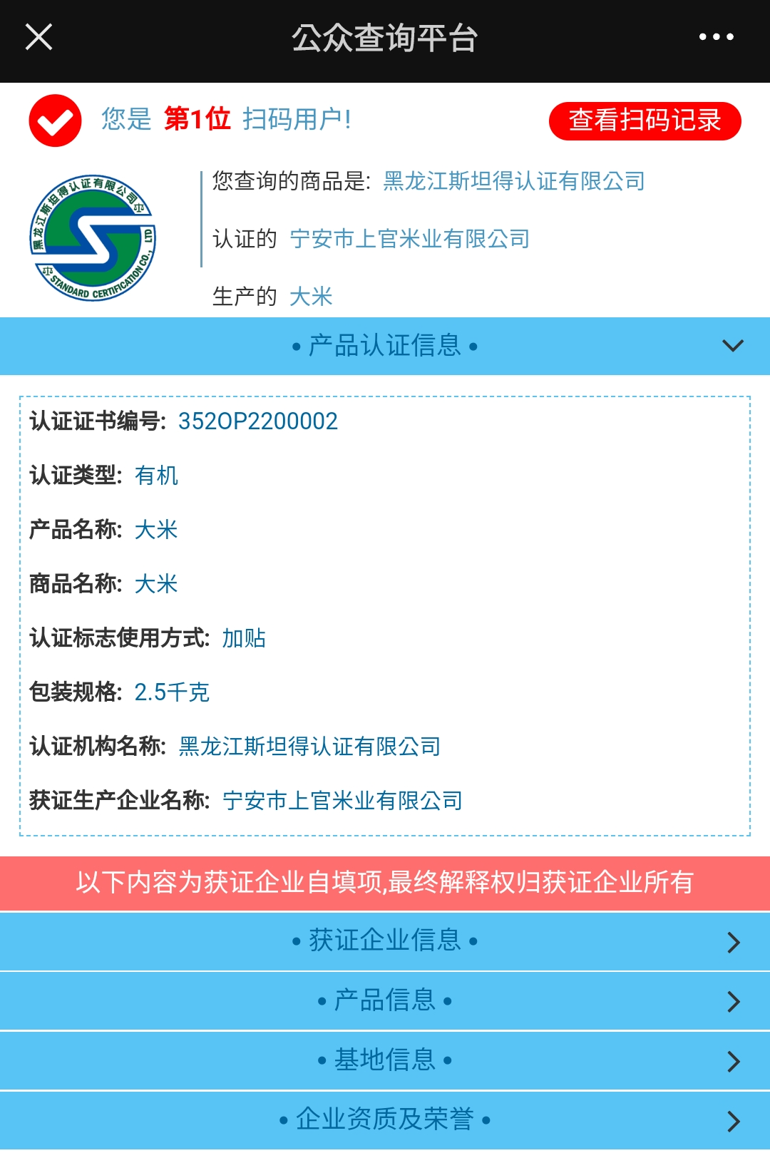 우질대미(优质大米)의 경우 쌀의 불투명한 부분의 비율을 나타내는 악백도(垩白度)와 시식평점(品尝评分) 부분이 추가되어 있다.