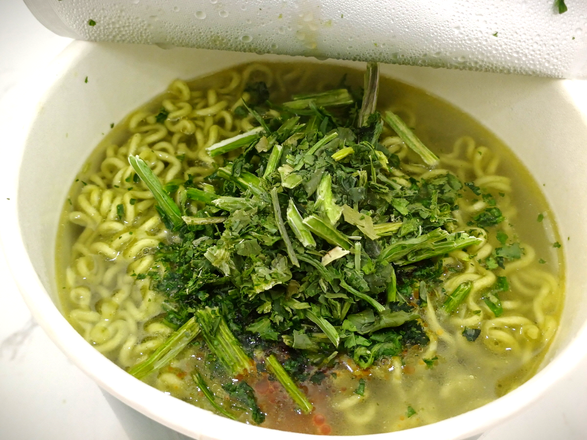컵라면 뚜껑을 열어보니 초록초록한 라면과 육수스프 1개, 건조 고수 2개, 접이식 포크가 담겨 있다.
