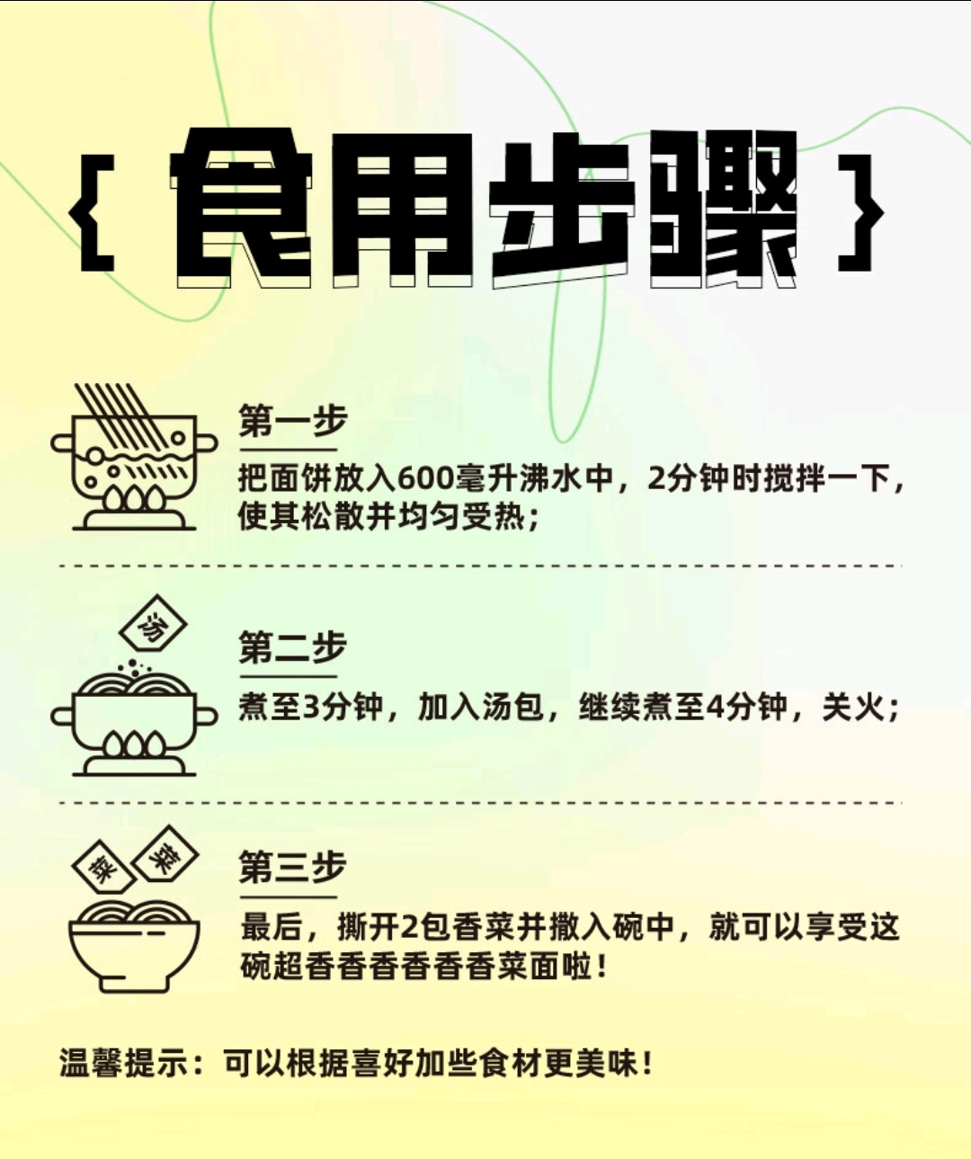 조리법은 600ml의 물을 끓인 후 면을 넣고 2분 경과 후 면을 저어주고, 3분 경과 후 탕 수프를 넣고 4분까지 끓인 후 건조 고수 2 봉지를 넣은 뒤 섞어서 먹으면 된다고 나와 있다. 매우 간단한 조리법이다.