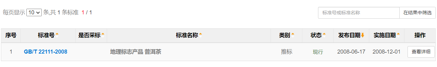 국가표준번호(GB/T)도 적혀 있어 조회를 해보니 지리표지산품 보이차로 검색이 바로 되었다. 한번 살펴보니 보이차에 대한 정의와 규정, 생산 지역 등을 확인할 수 있었다.