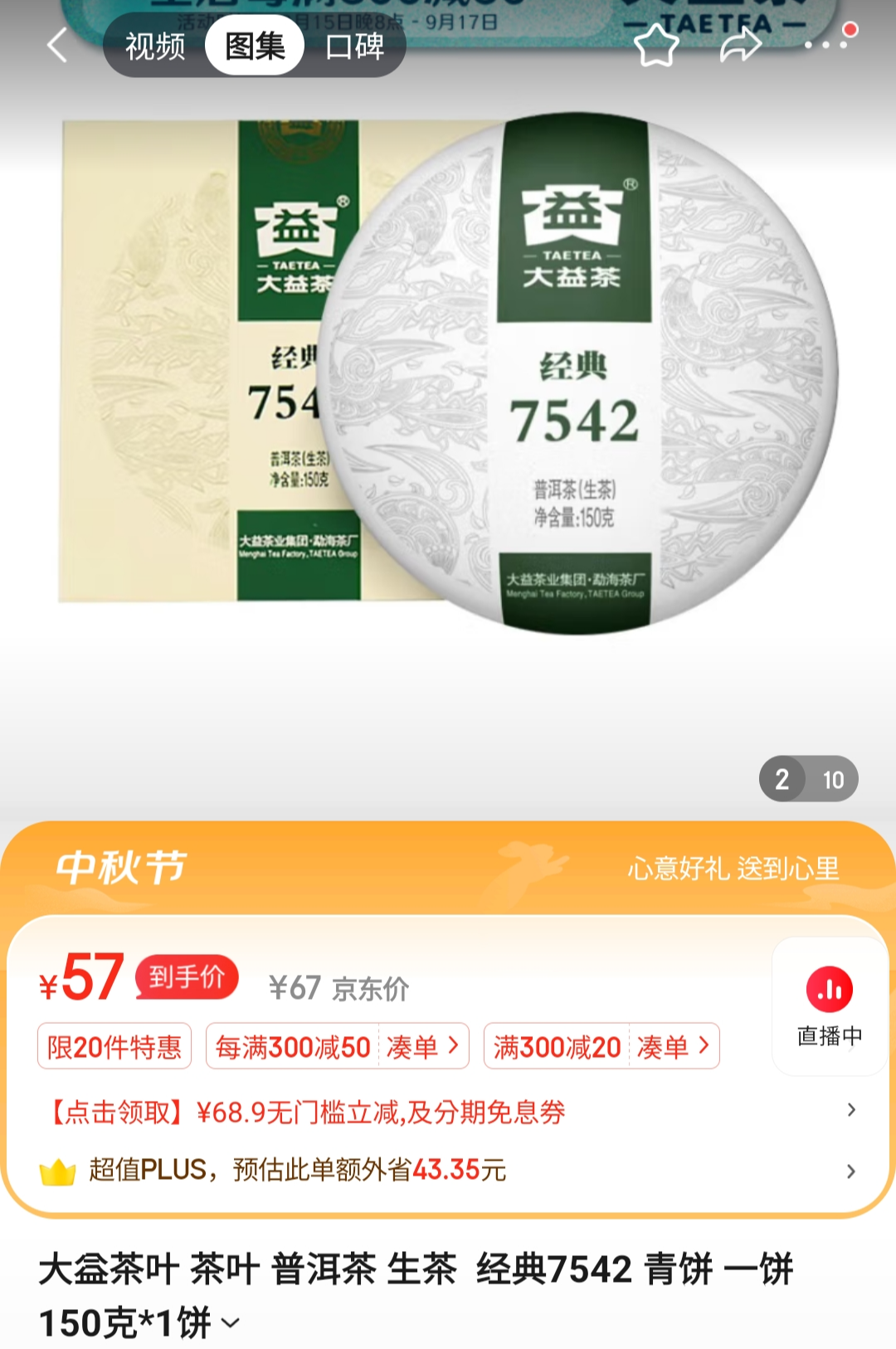 징동 온라인 쇼핑몰에서 '대익(大益)' 키워드로 검색 후 대익보이차 전용몰이 나와서 둘러보니 150g짜리 보이차 생차와 숙자가 최다 판매량 제품으로 올라와 있었다.
