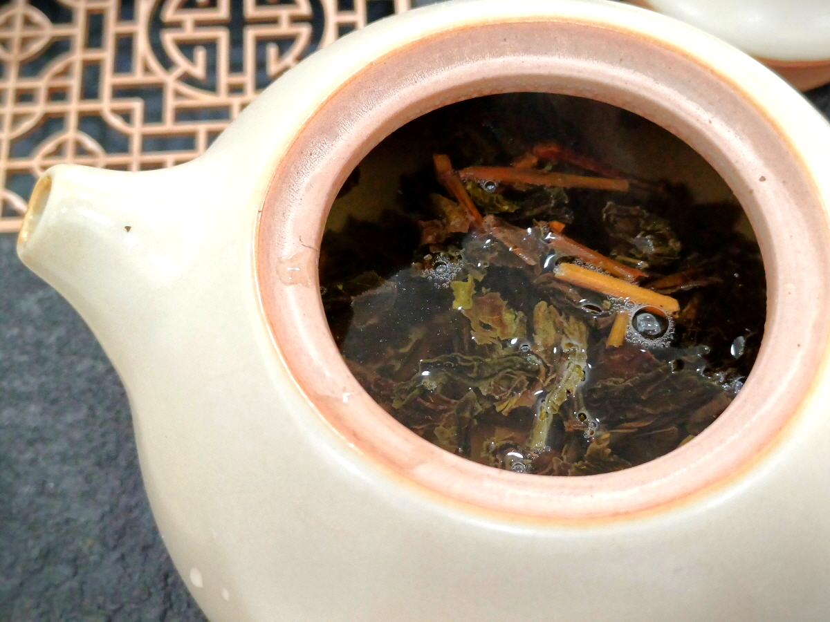 우리기 전의 찻잎을 살펴보니 완전히 산화되어서 살짝 건드려도 부스러질 정도로 바삭바삭했다. 보이차에 대해서 모르는 사람이 본다면 썩은 나무라고 착각해도 무리가 아닐 정도다. 냄새도 매우 쿰쿰하고 아직 우리기 전인대도 사방에 진한 향을 풍긴다.