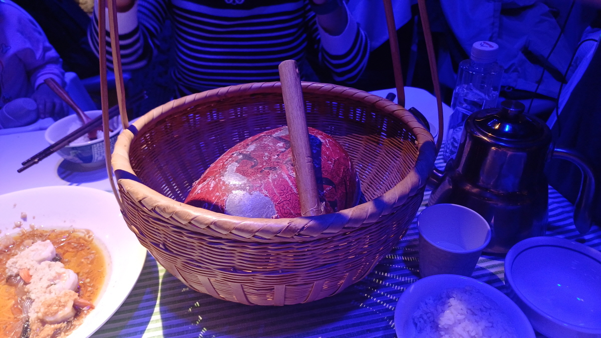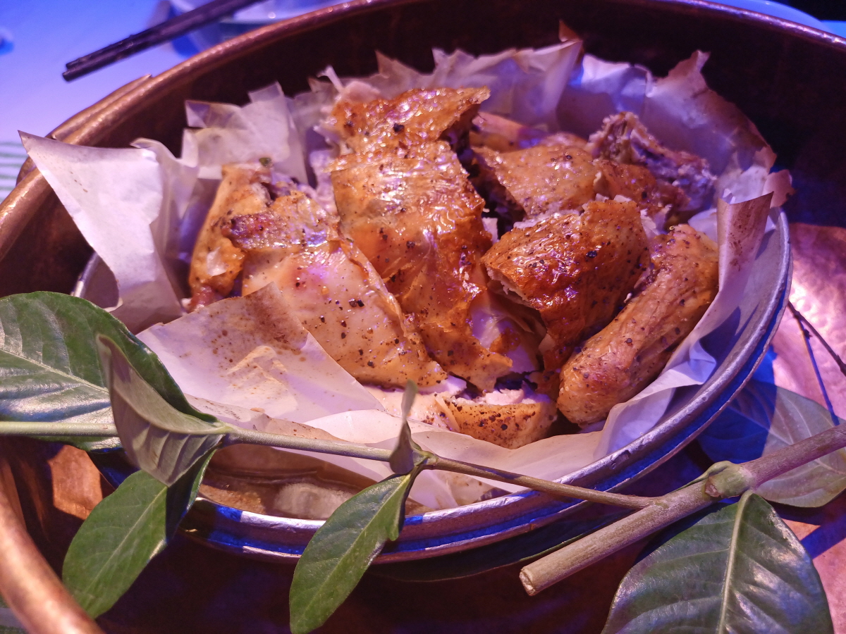 음식이 나오기 전에 닭이 담겨 있는 쇠그릇을 종업원이 바구니에 담아서 가져오는데, 망치로 몇 번 두드리라고 시킨다. 원래는 닭 표면에 흑을 덮어 구운 후 망치로 깨서 먹는 요리인데, 그냥 비슷하게 흉내 내는 퍼포먼스인 것 같다.