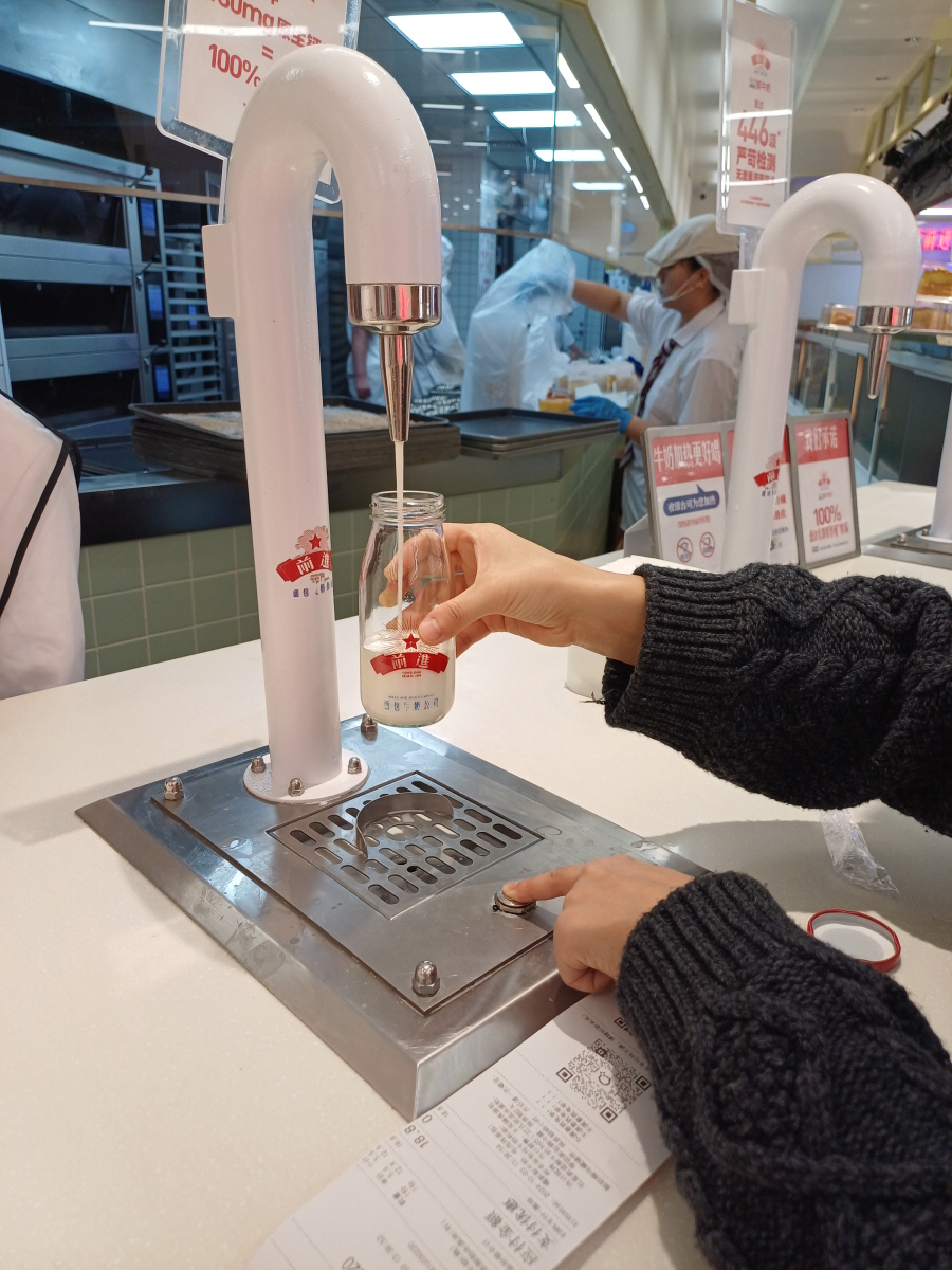 우유는 계산대에서 계산을 하고 받은 주문서를 직원에게 건네주면 빈 유리병을 주는데, 이 유리병에 셀프로 우유를 받아가는 방식이다.