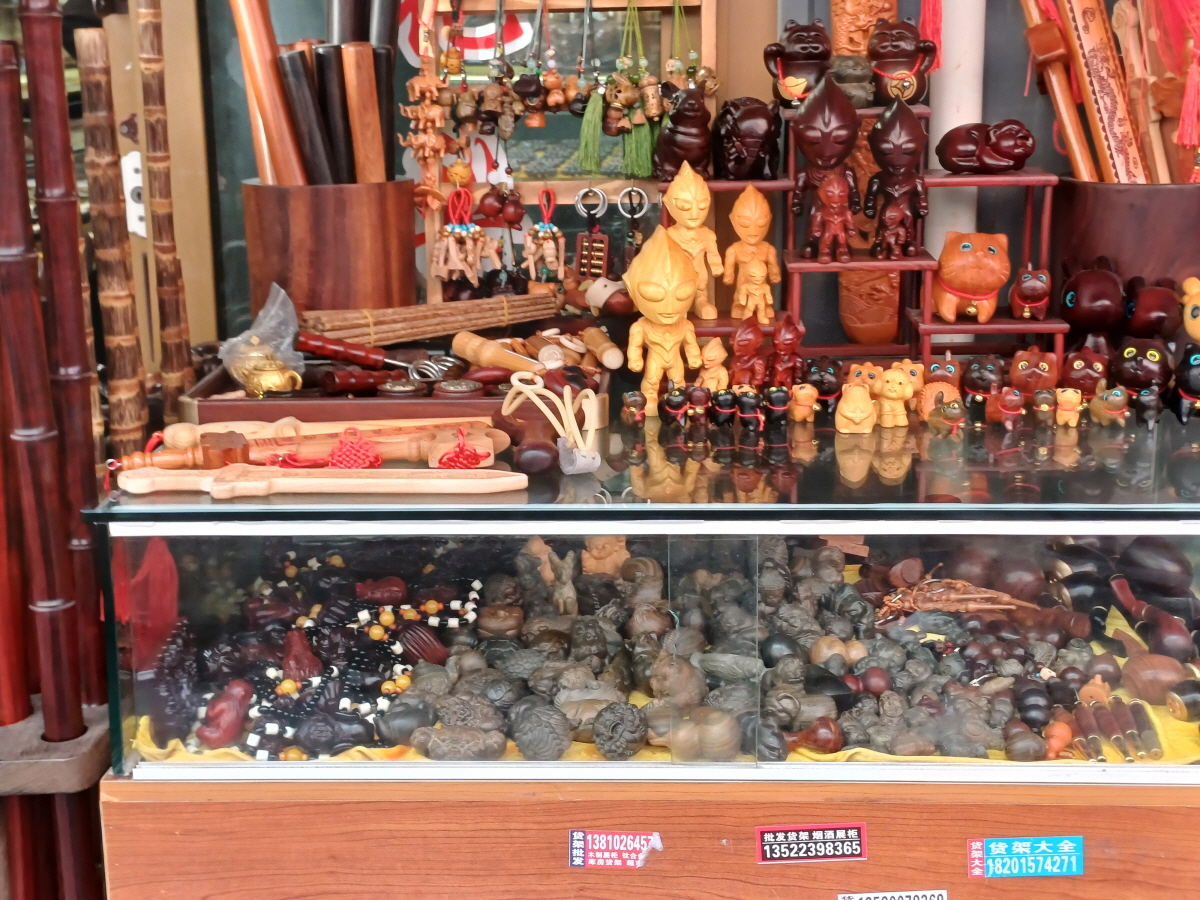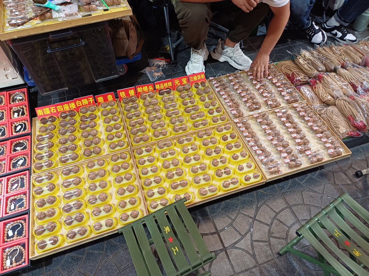 호두를 늘어놓고 판매를 하고 있는데 이런 호두를 '문완호두(文玩核桃)'라고 부른다고 한다. 손 지압 노리개 용도인데 모양에 따라 고가에 판매되기도 한다고 한다.