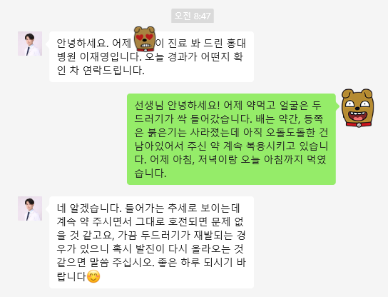 병원을 갔다온 뒤 아이가 낮잠을 자고 일어나니 두드러기가 싹 들어갔다. 그리고 다음날 아침 진료를 봐주셨던 의사선생님께서는 아이 증상에 대해서 문의도 해주셨다. 감동 ㅠㅠ