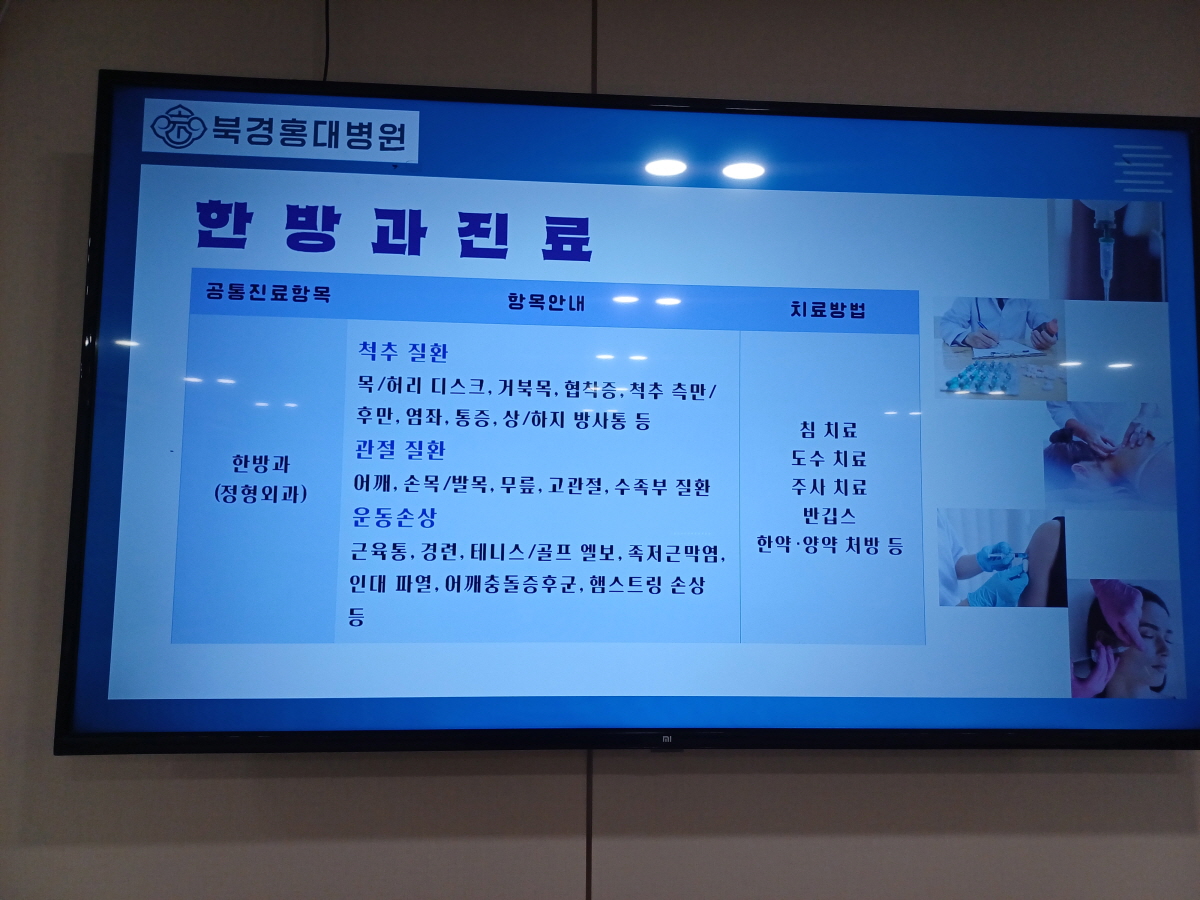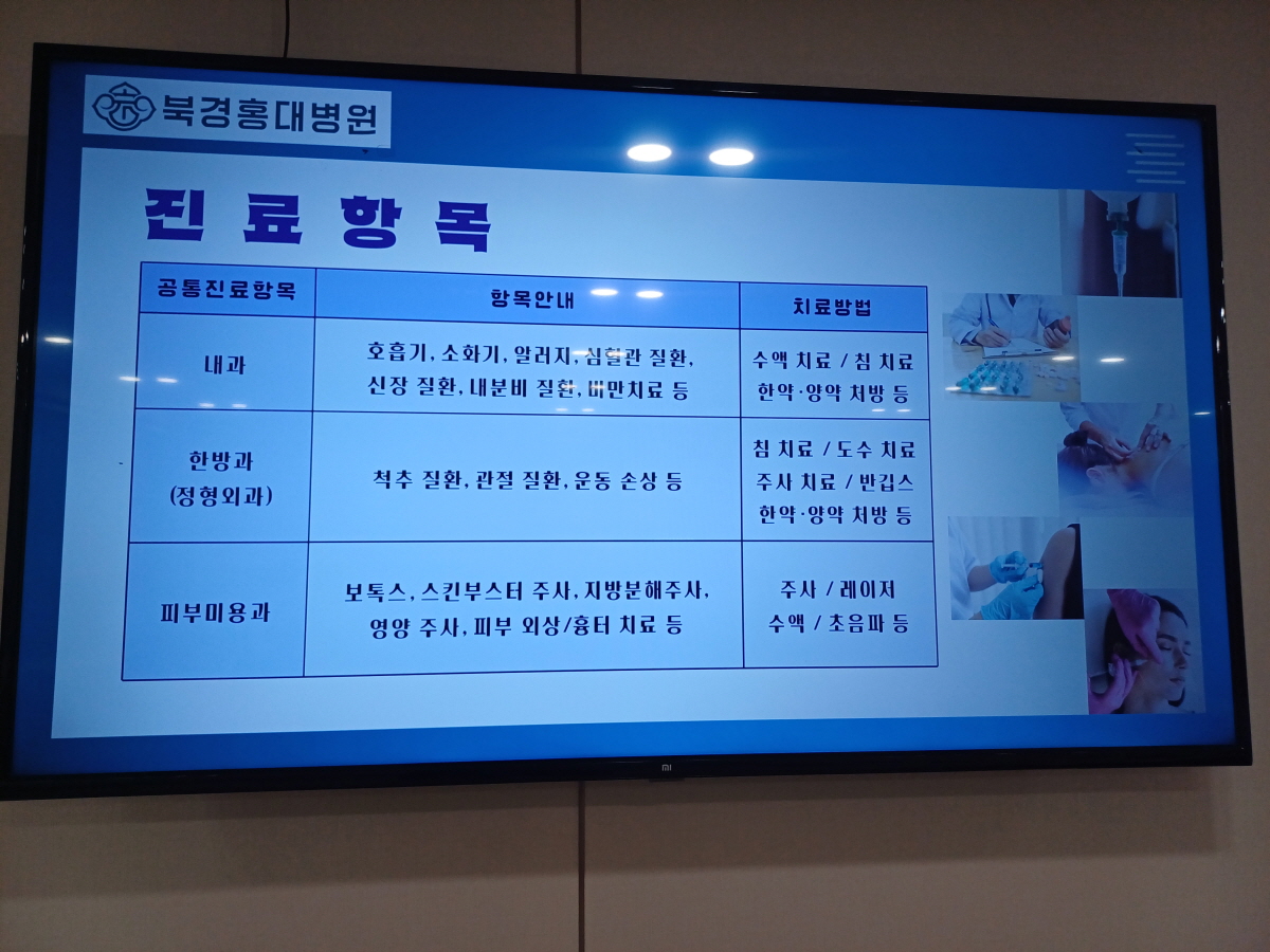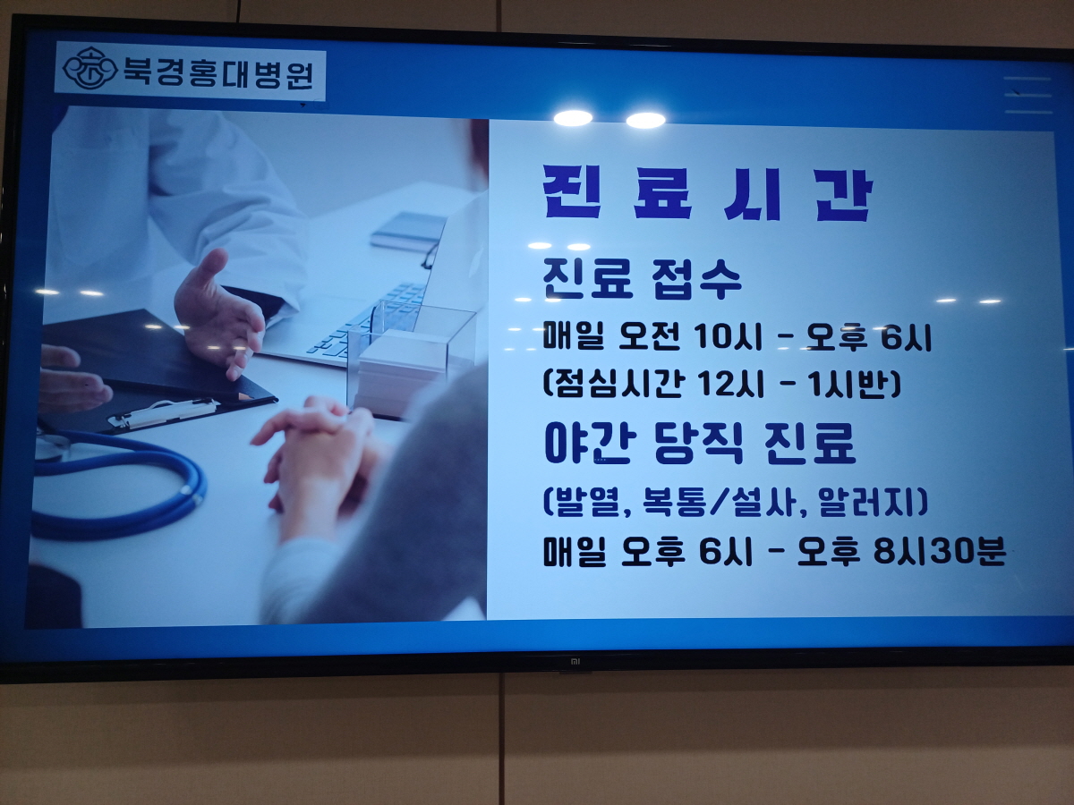 병원 내 스크린에서 병원 소개가 나오길래 몇 장 찍어봤다. 야간 당직 진료도 하기 때문에 급한 경우에는 참조해서 방문하면 될 것 같다.