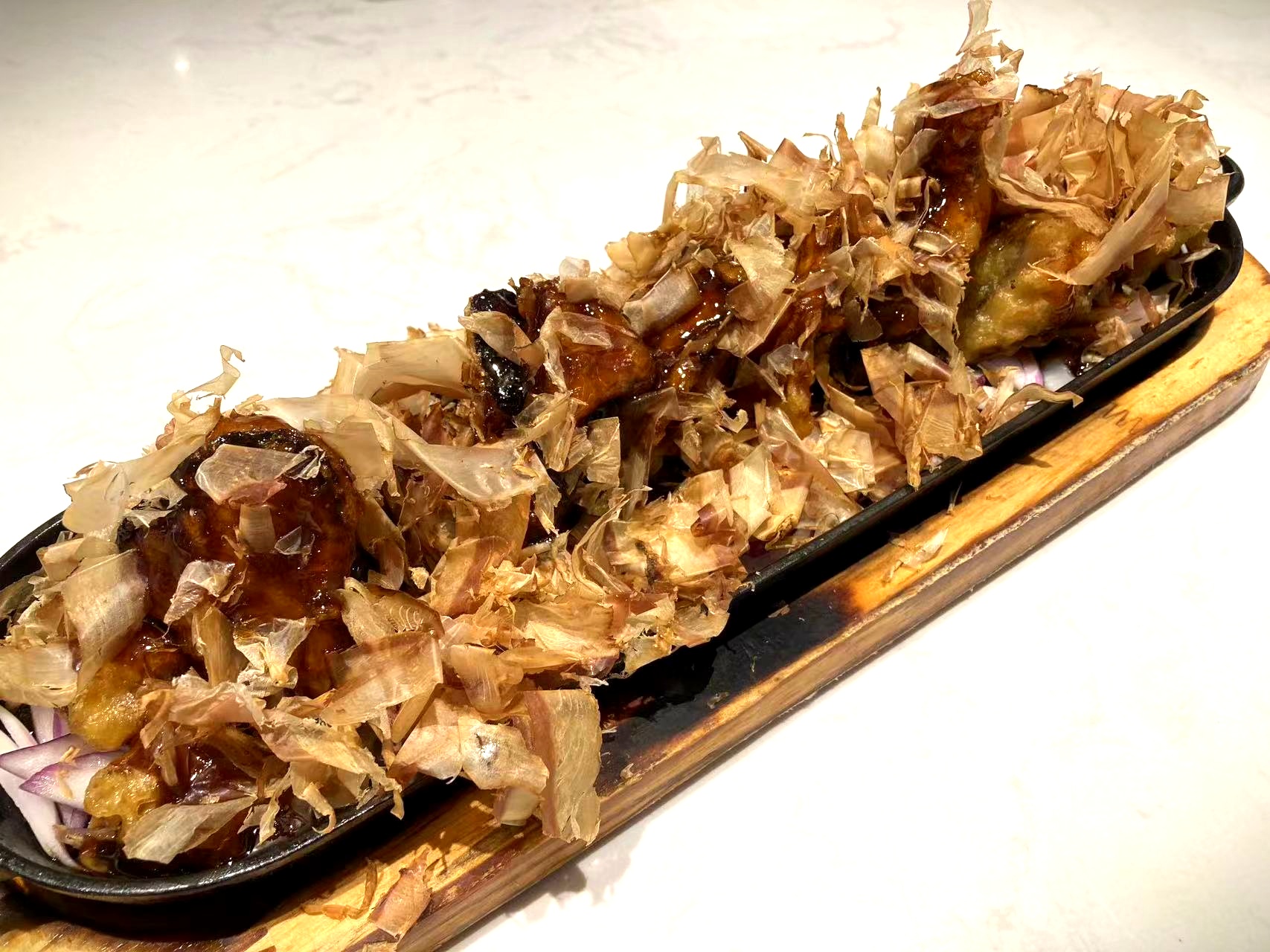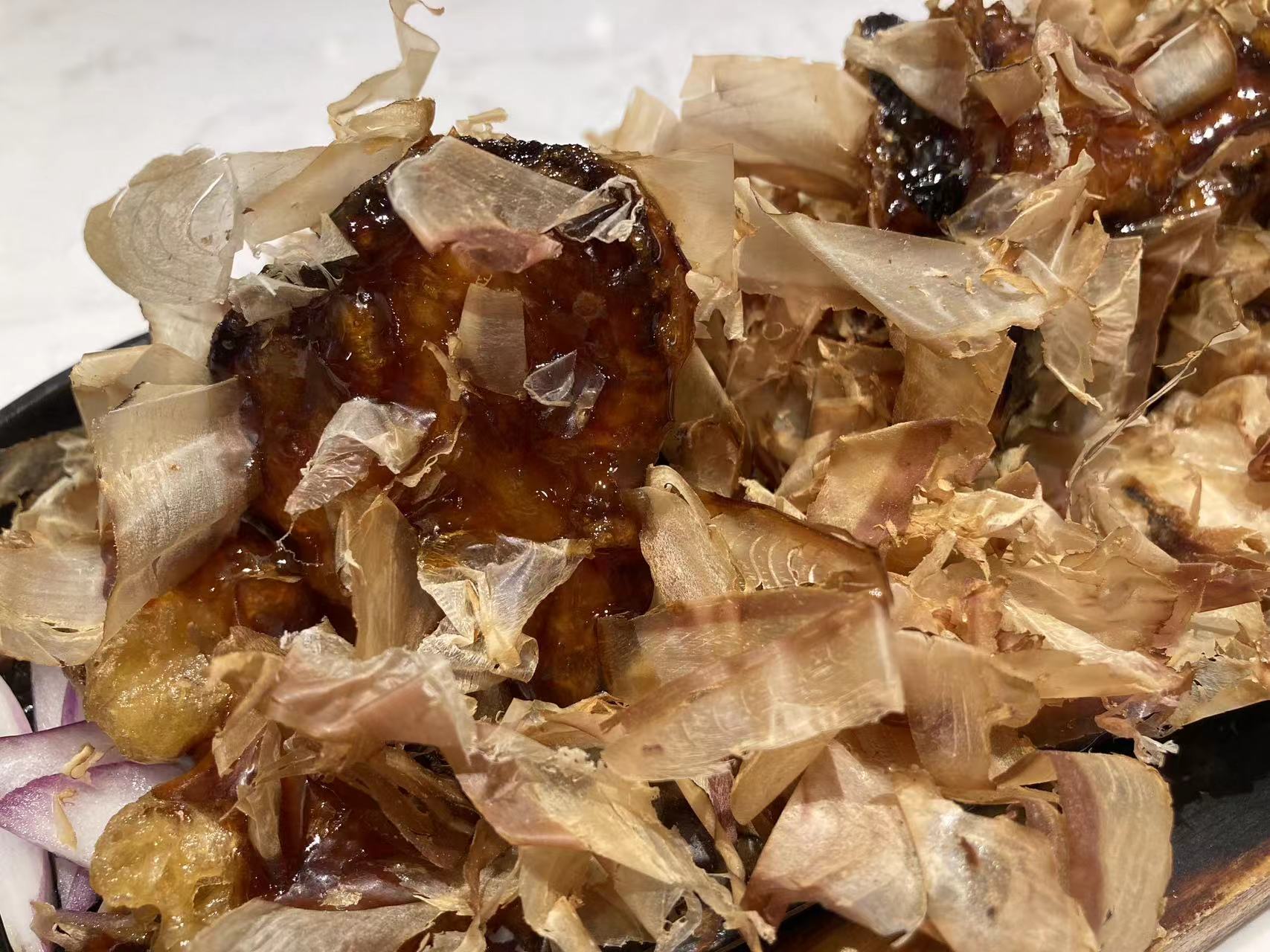 가지요리가 먼저 나왔는데 가지 안에 고기를 넣어 튀긴 후 접시 바닥에 붉은 양파를 깔고, 가지 튀김 위에 가쓰오부시 토핑을 올리고 데리야끼소스를 뿌려 철판에 담아내는 요리다.